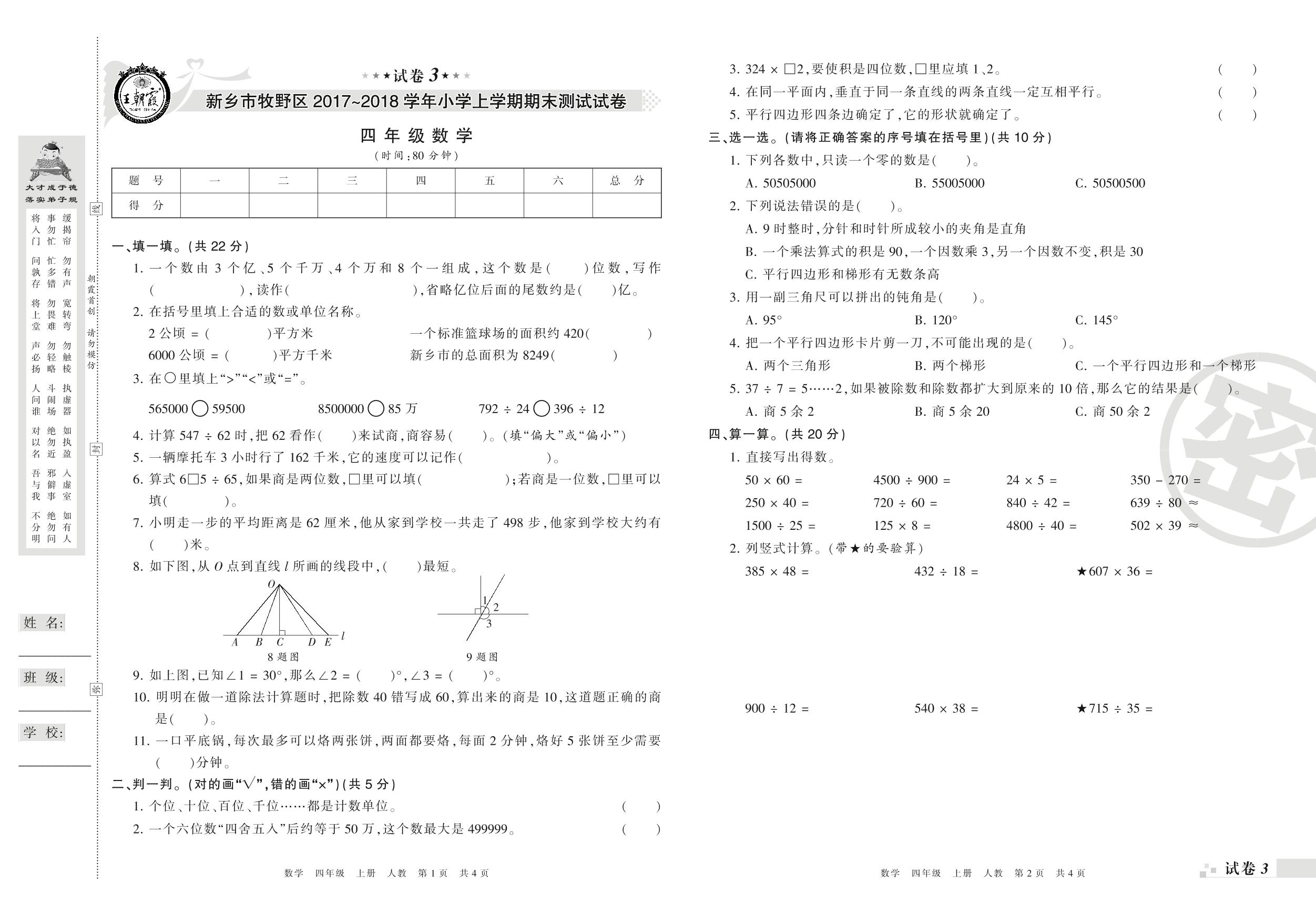 2017-2018学年第一学期新乡市牧野区四年级数学试卷(人教版)【3】