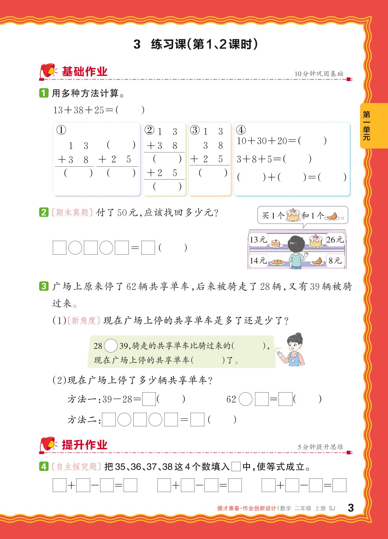 2024秋上册二年级数学苏教版 第一单元 100以内的加法和减法(三)——3. 连加、连减 加减混合运算练习课