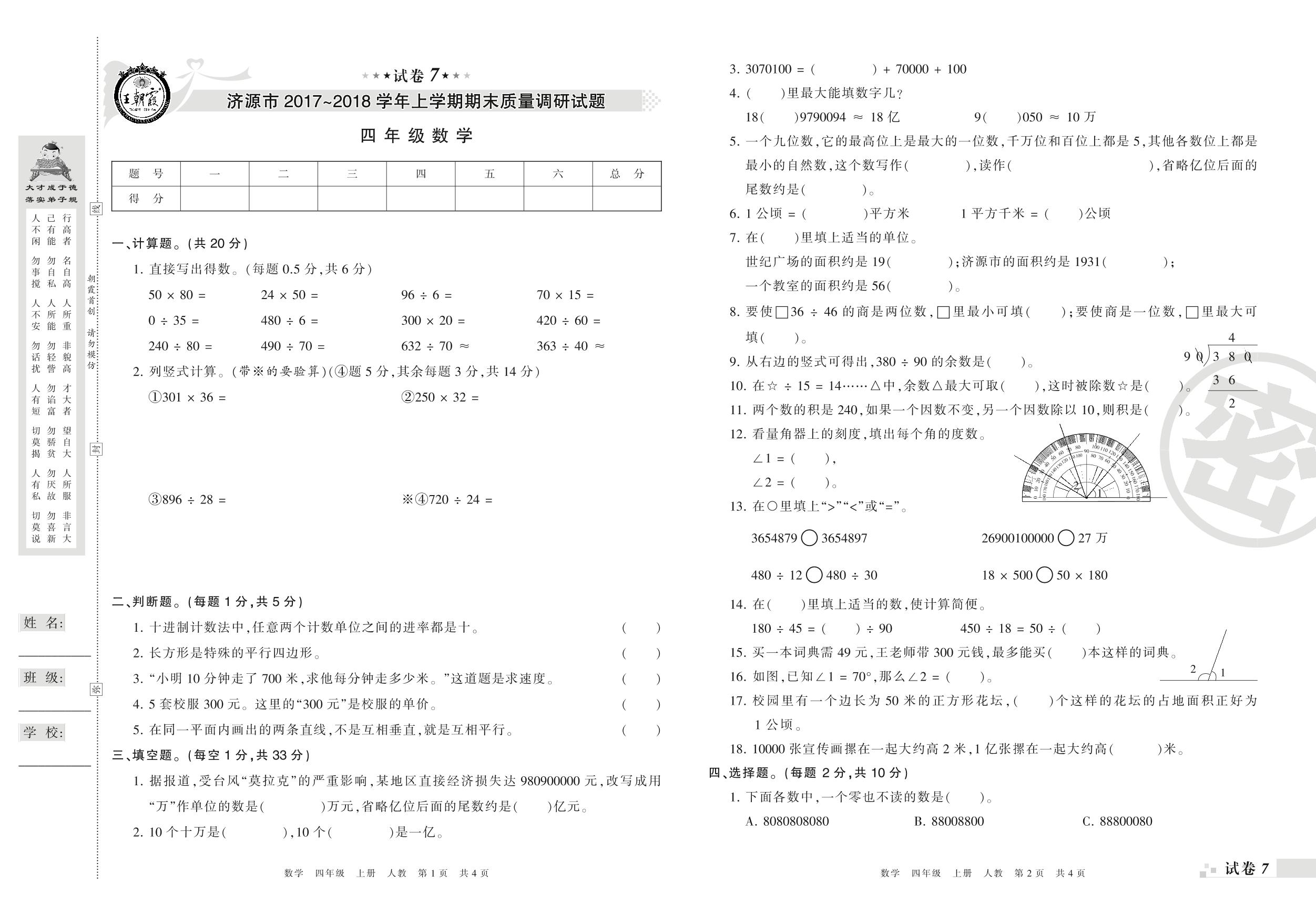 2017-2018学年第一学期济源市四年级数学试卷(人教版)【7】