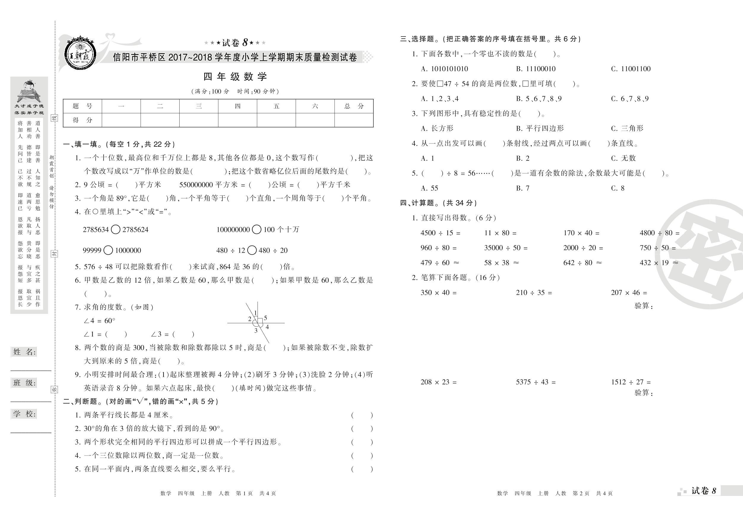 2017-2018学年第一学期信阳市平桥区四年级数学试卷(人教版)【8】
