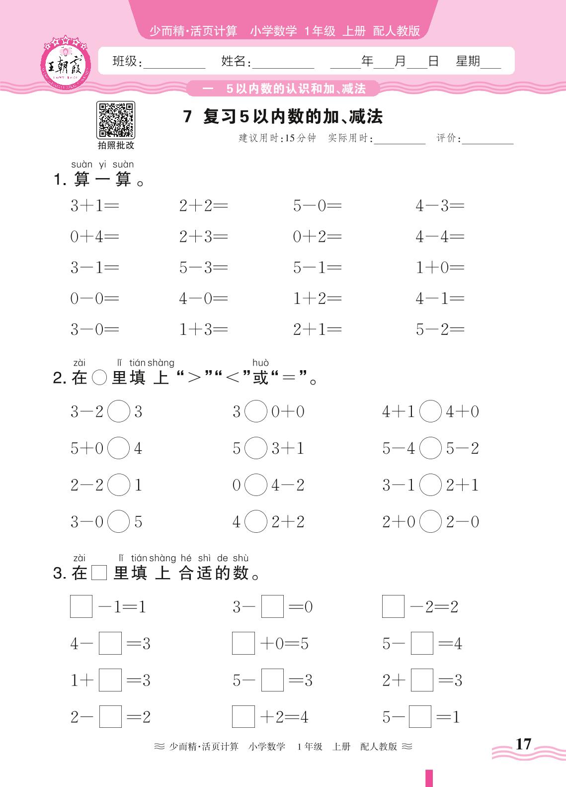 2024秋上册一年级数学人教版 第一单元 5以内数的认识和加、减法——7. 复习5以内数的加、减法