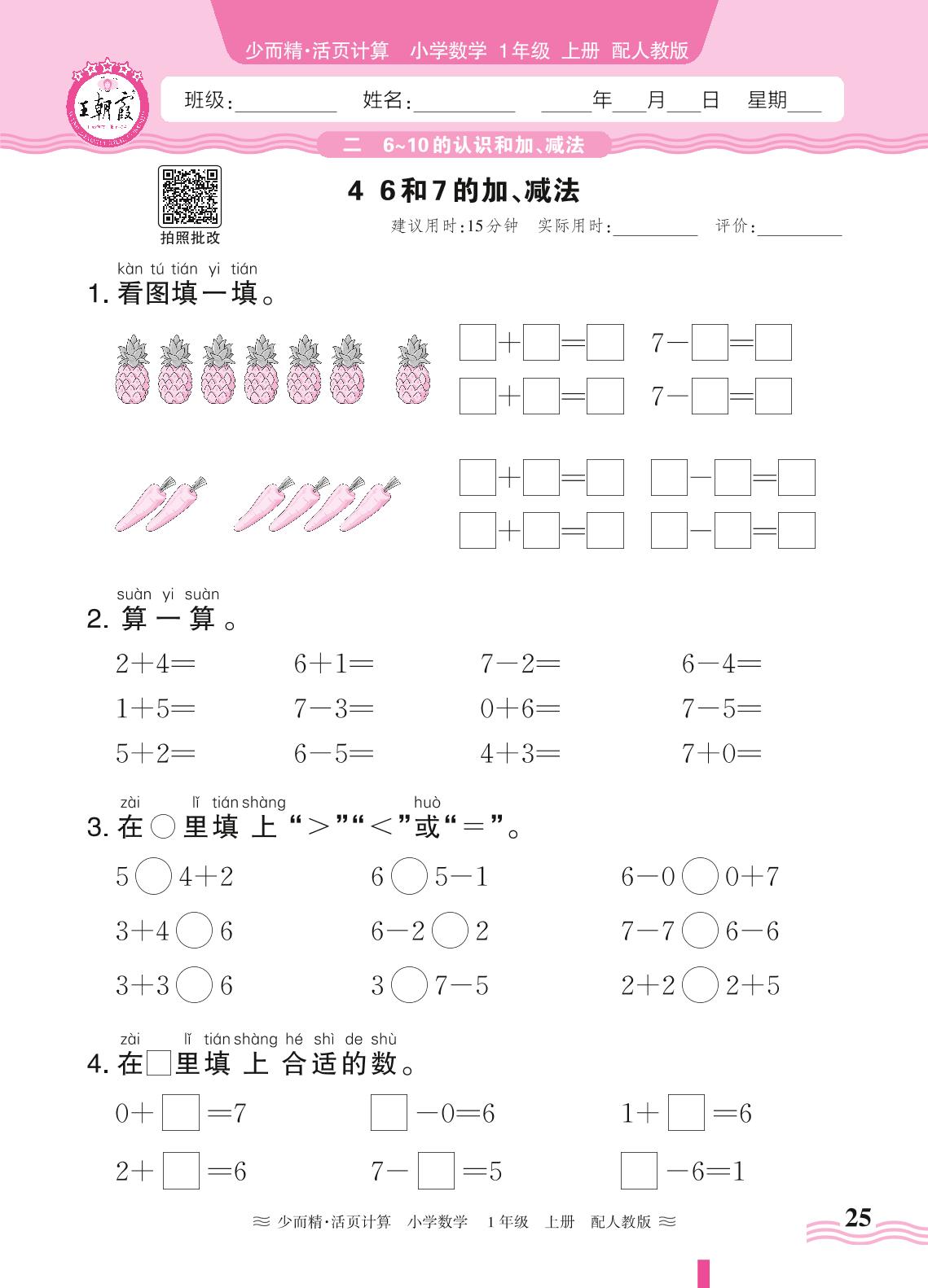 2024秋上册一年级数学人教版 第二单元 6~10的认识和加、减法——4. 6和7的加、减法
