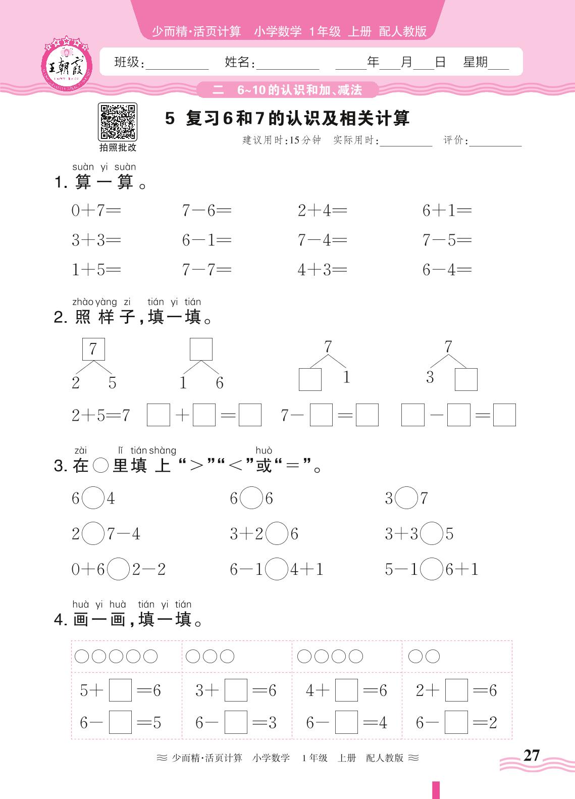 2024秋上册一年级数学人教版 第二单元 6~10的认识和加、减法——5. 复习6和7的认识及相关计算