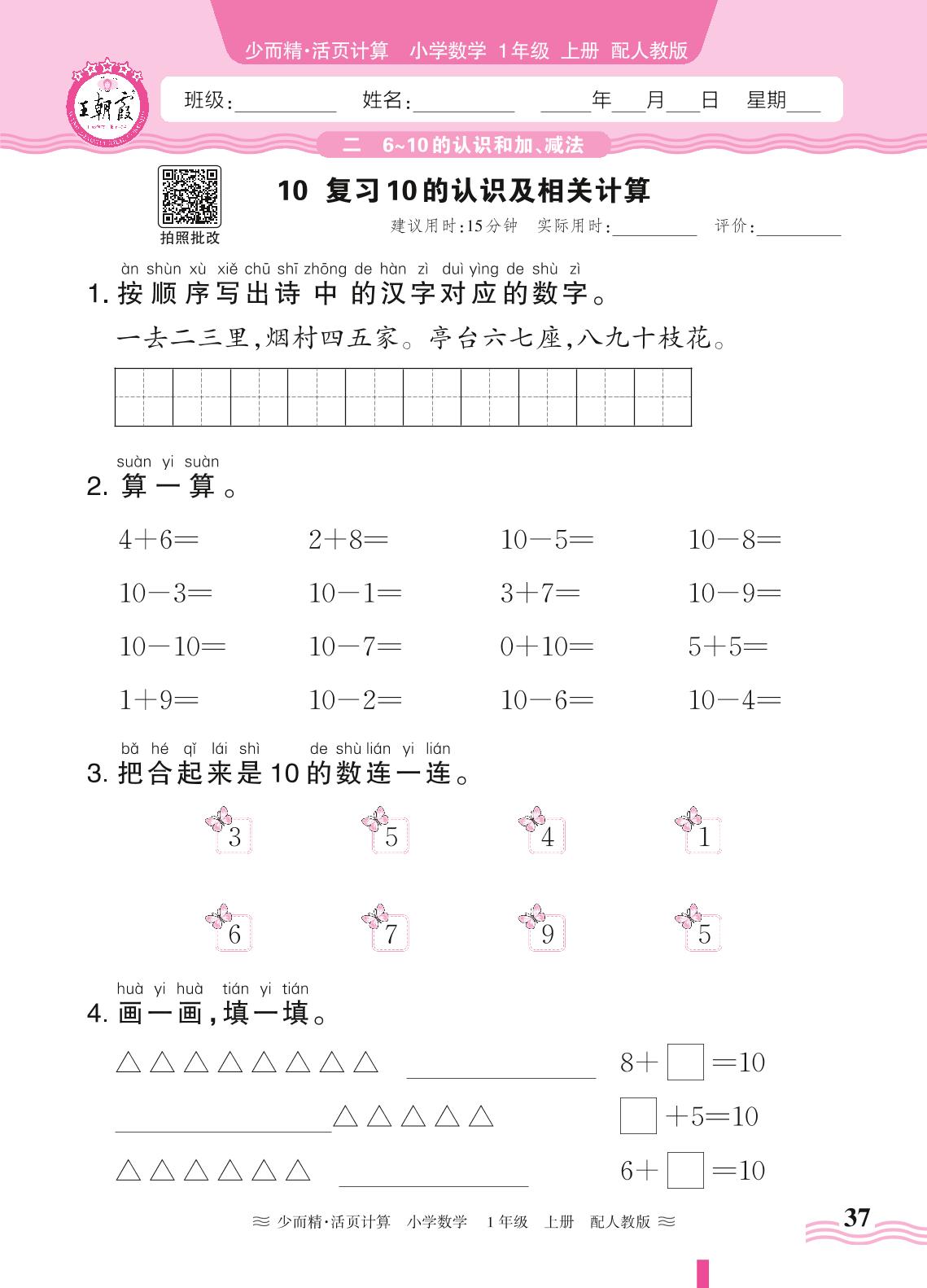 2024秋上册一年级数学人教版 第二单元 6~10的认识和加、减法——10. 复习10的认识及相关计算