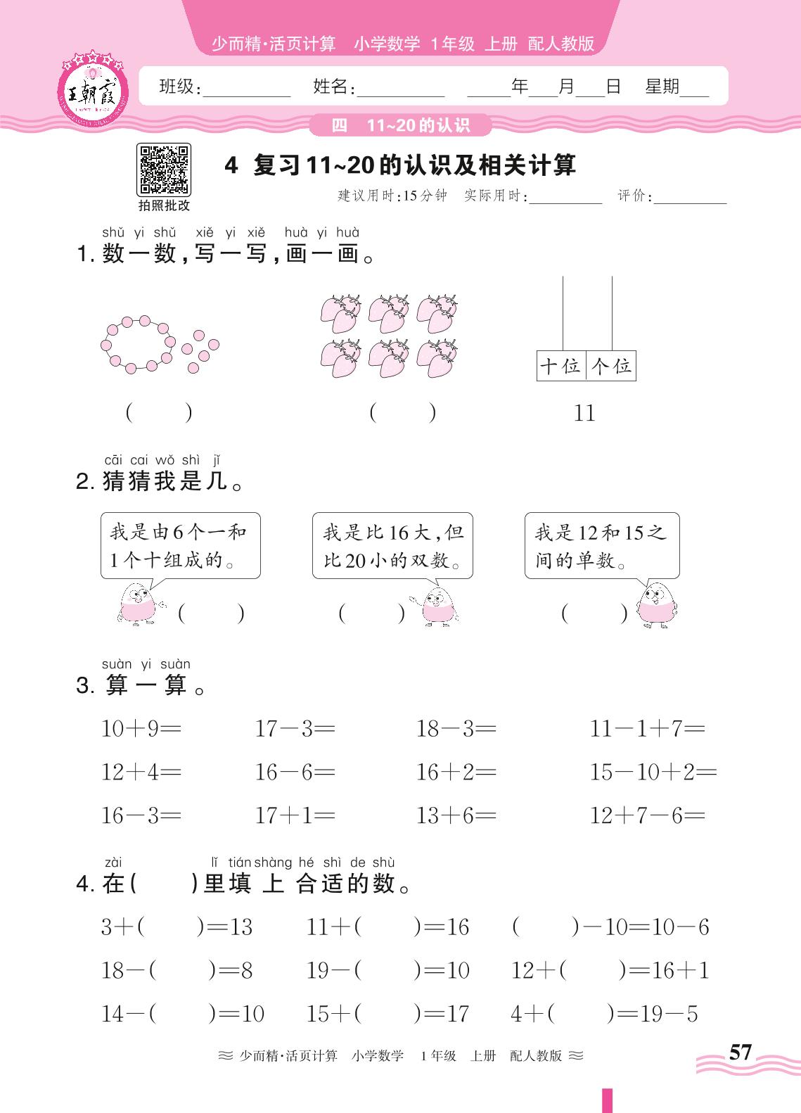 2024秋上册一年级数学人教版 第四单元 11~20的认识——4. 复习11~20的认识及相关计算