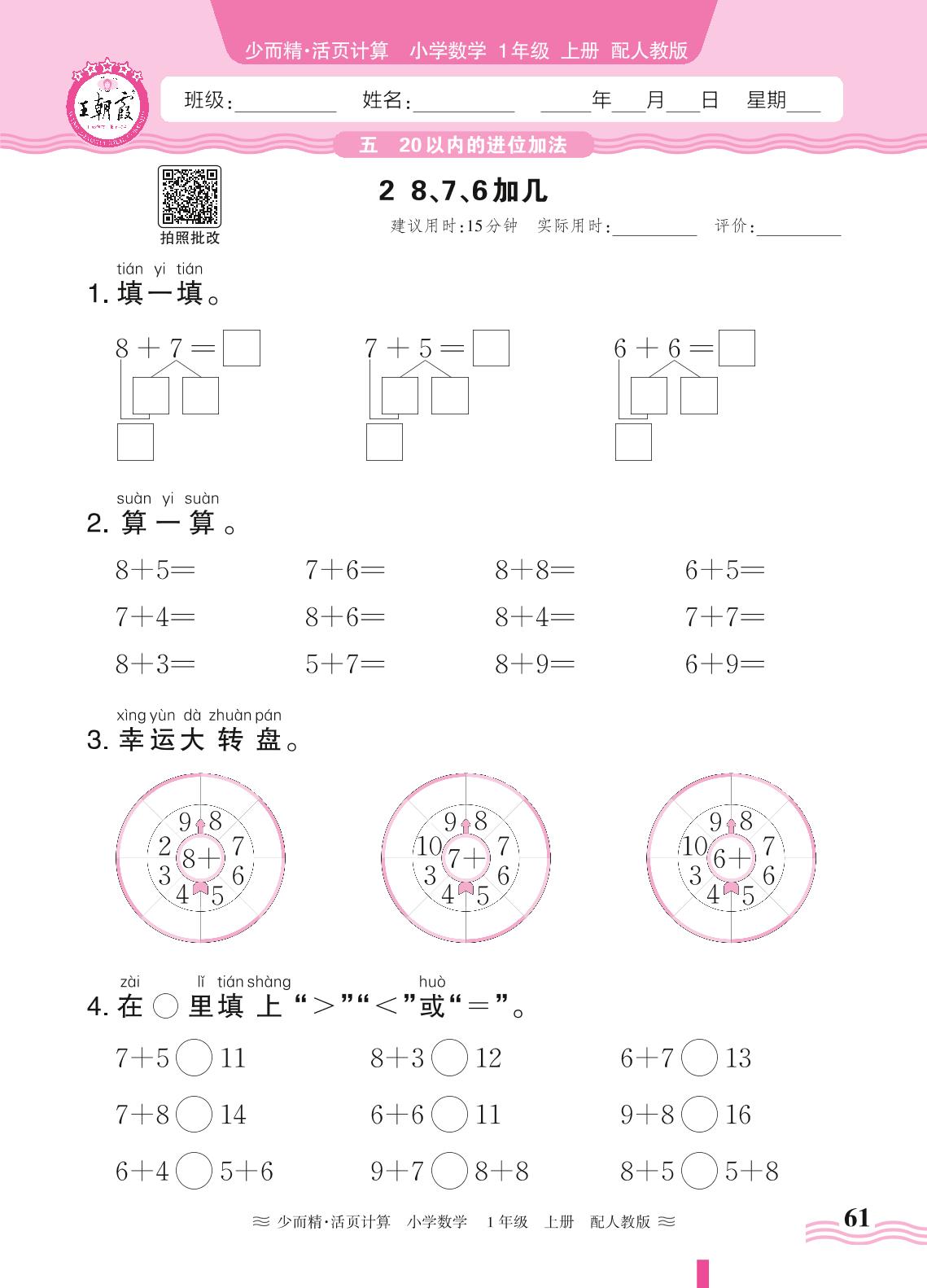 2024秋上册一年级数学人教版 第五单元 20以内的进位加法——2. 8、7、6加几