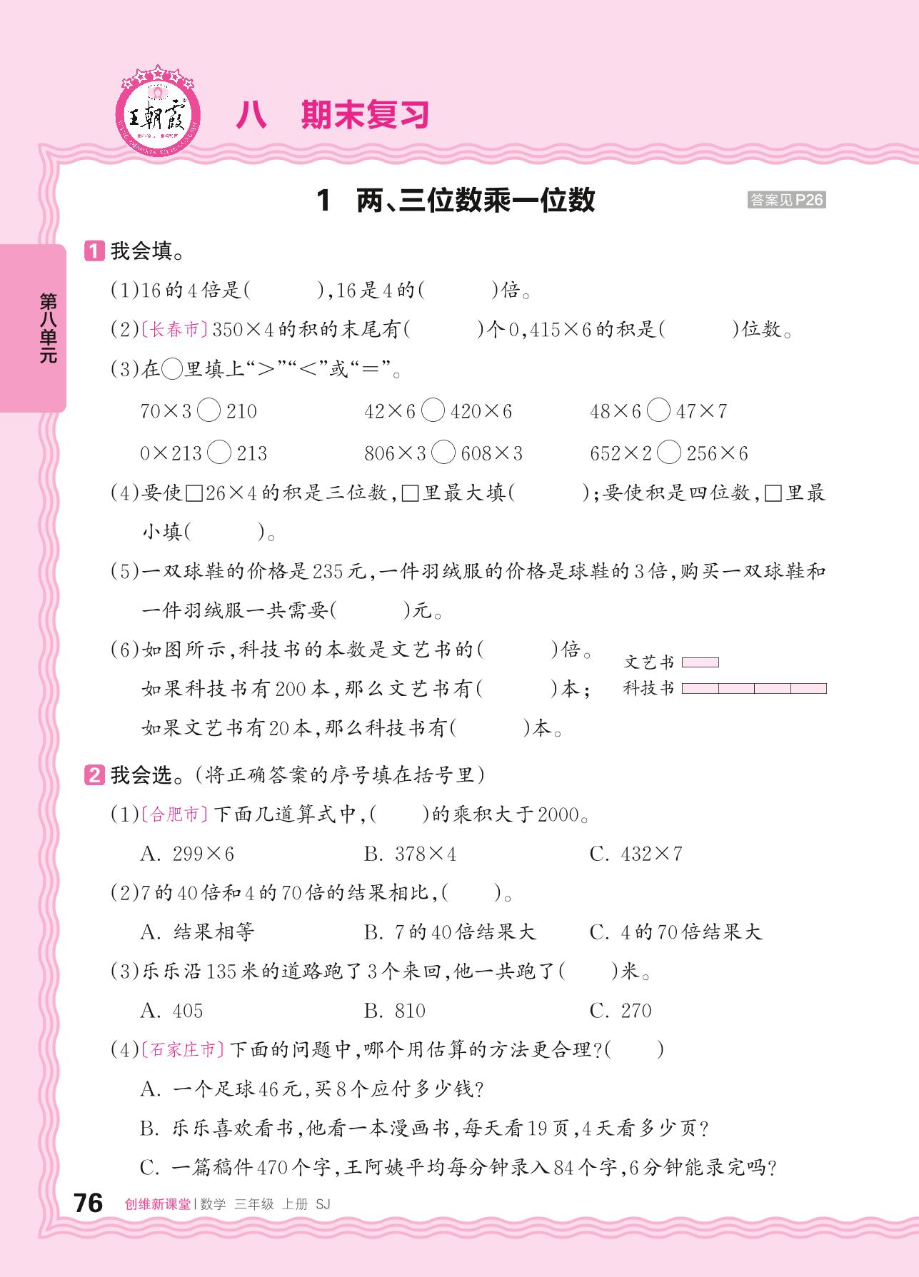 2024秋上册三年级数学苏教版 第八单元 期末复习——1. 两、三位数乘一位数