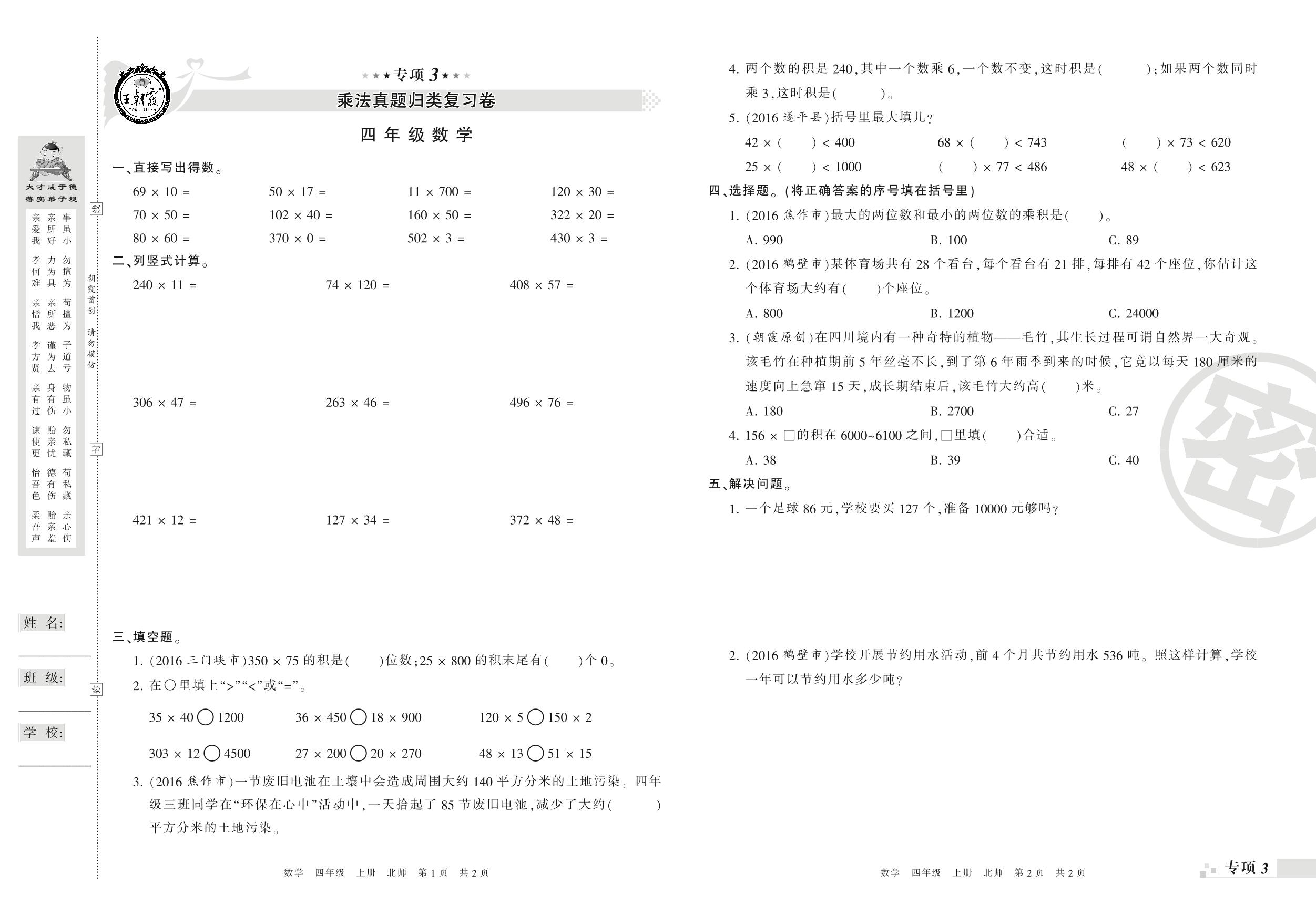 王朝霞期末专项卷——乘法、运算律真题归类复习卷四年级上册数学(北师版)_R210804155217【0】
