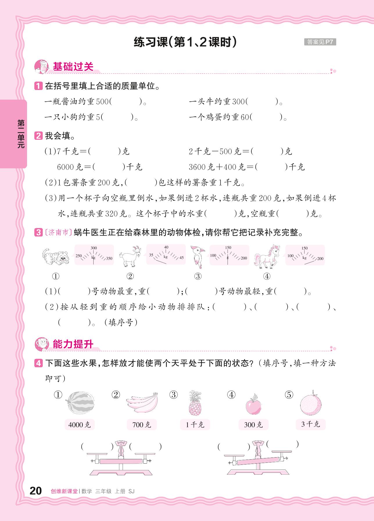 2024秋上册三年级数学苏教版 第二单元 千克和克 ——认识千克、克练习课
