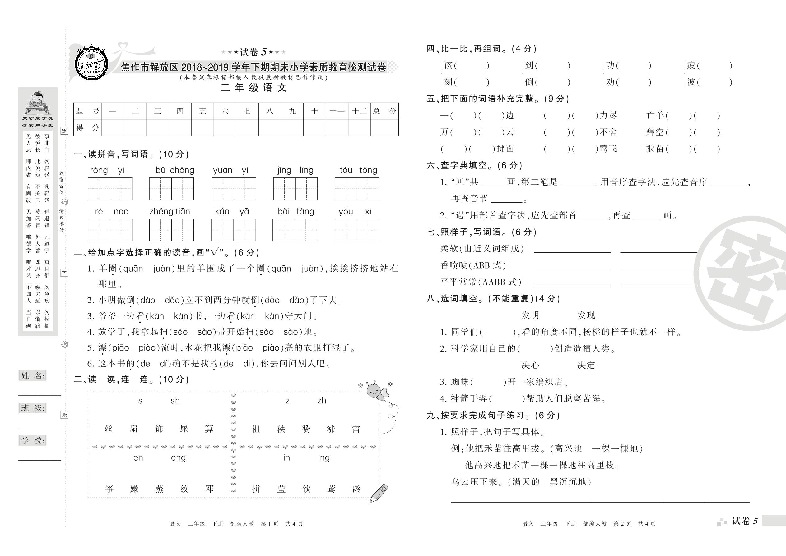 2018-2019学年第二学期焦作市解放区二年级语文试卷(人教版)【5】