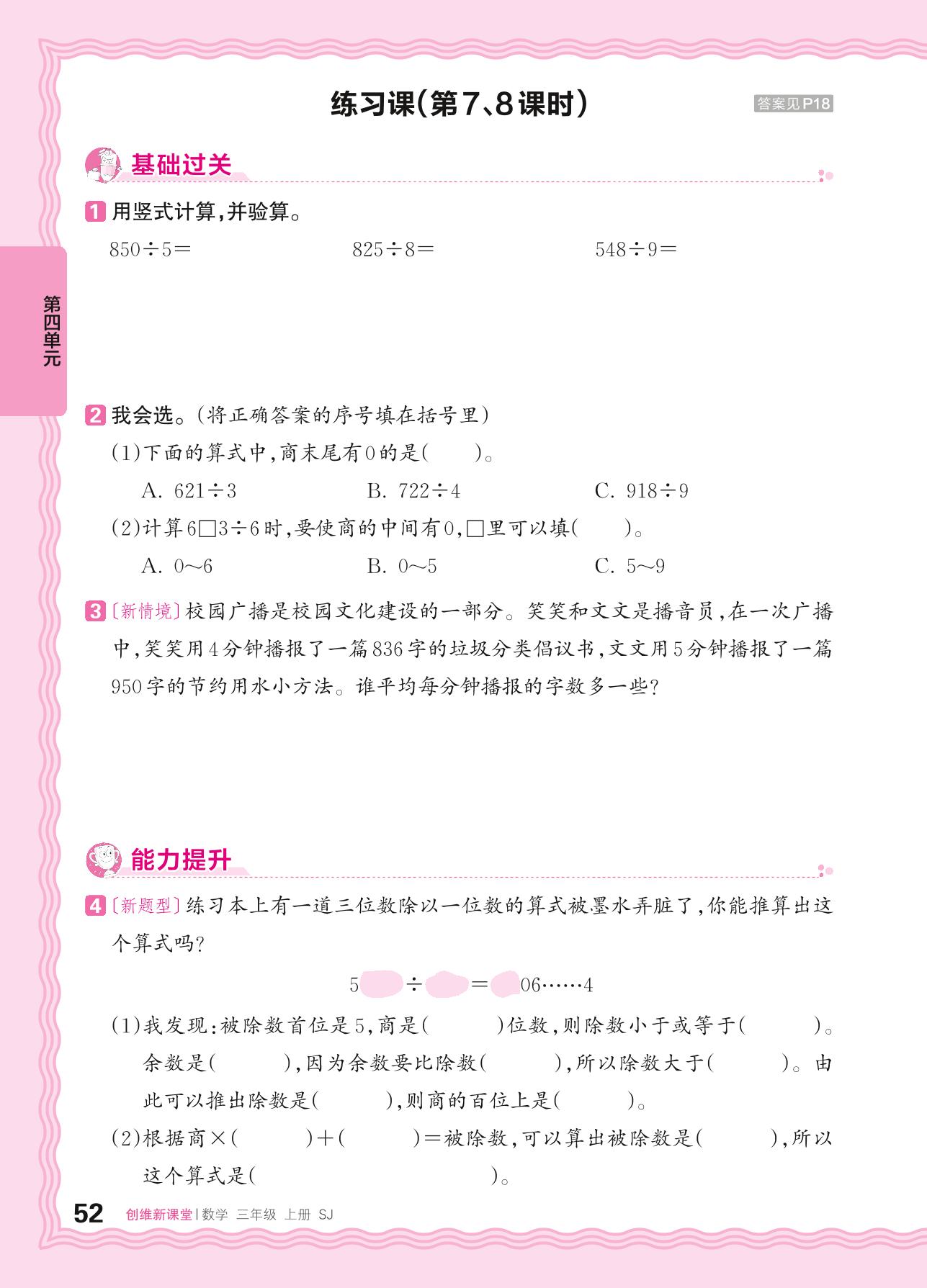 2024秋上册三年级数学苏教版 第四单元 两、三位数除以一位数——商中间或末尾有0的除法练习课