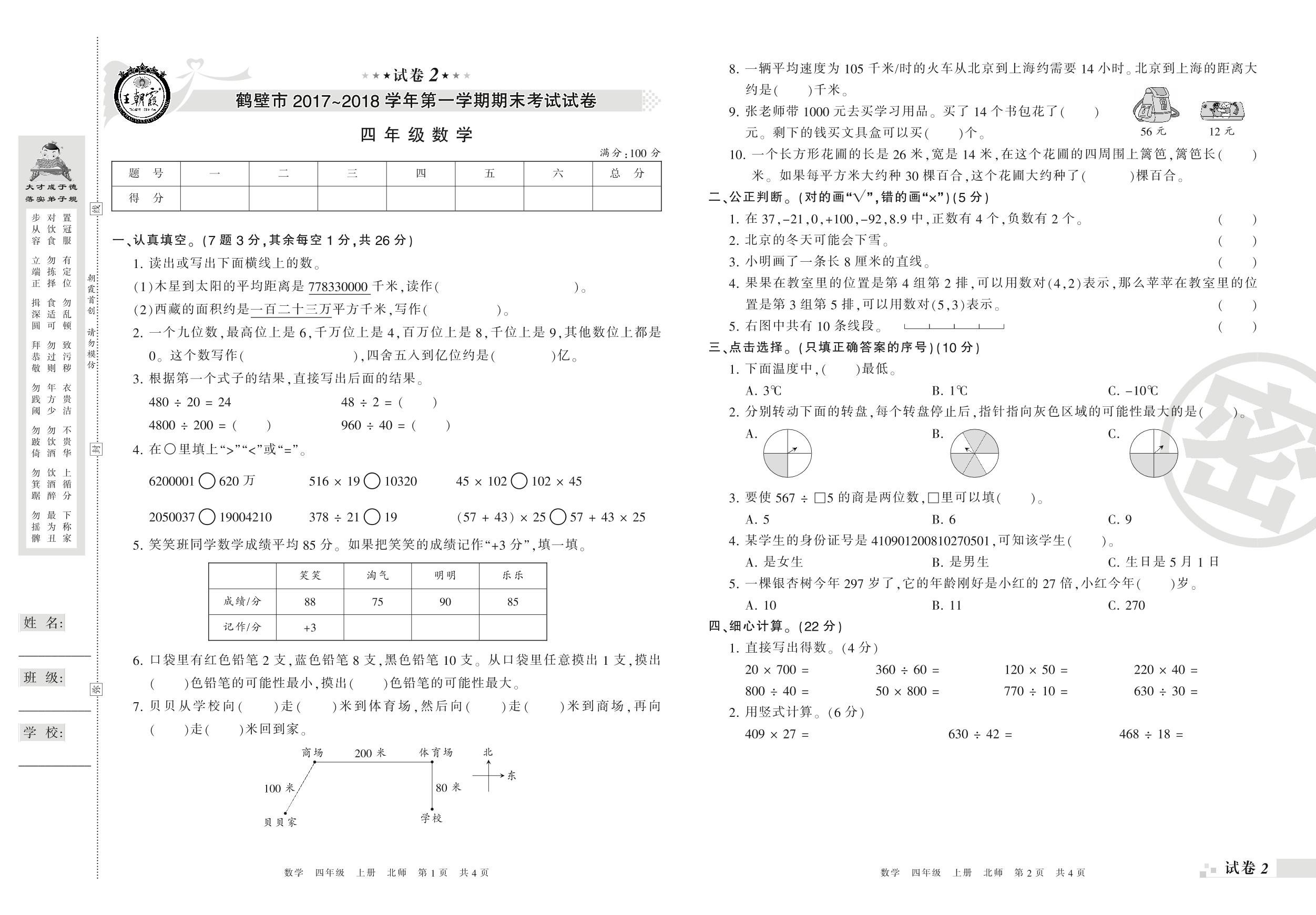 2017-2018学年第一学期鹤壁市四年级数学试卷(北师版)【2】