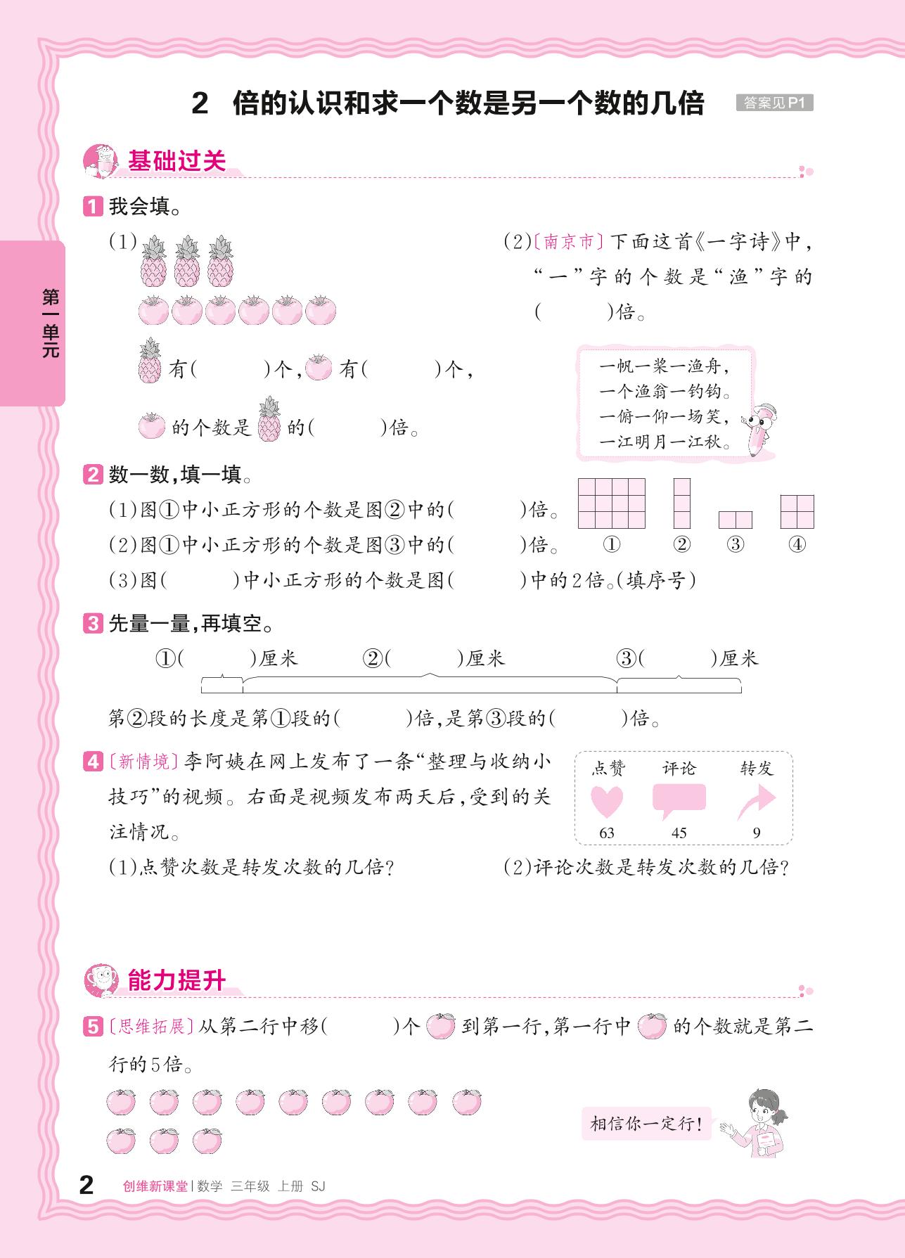 2024秋上册三年级数学苏教版 第一单元 两、三位数乘一位数——2. 倍的认识和求一个数是另一个数的几倍