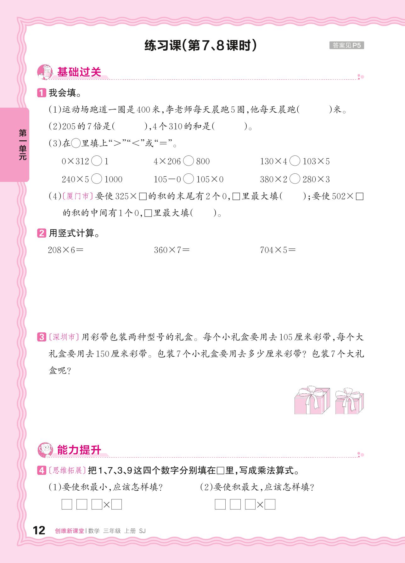 2024秋上册三年级数学苏教版 第一单元 两、三位数乘一位数——乘数中间或末尾有0的乘法练习课