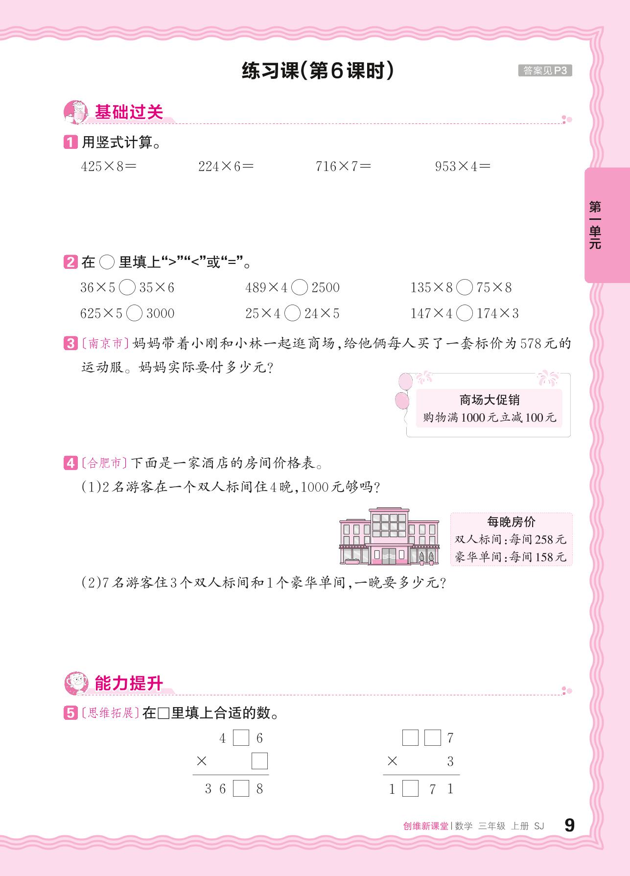 2024秋上册三年级数学苏教版 第一单元 两、三位数乘一位数——连续进位乘法练习课