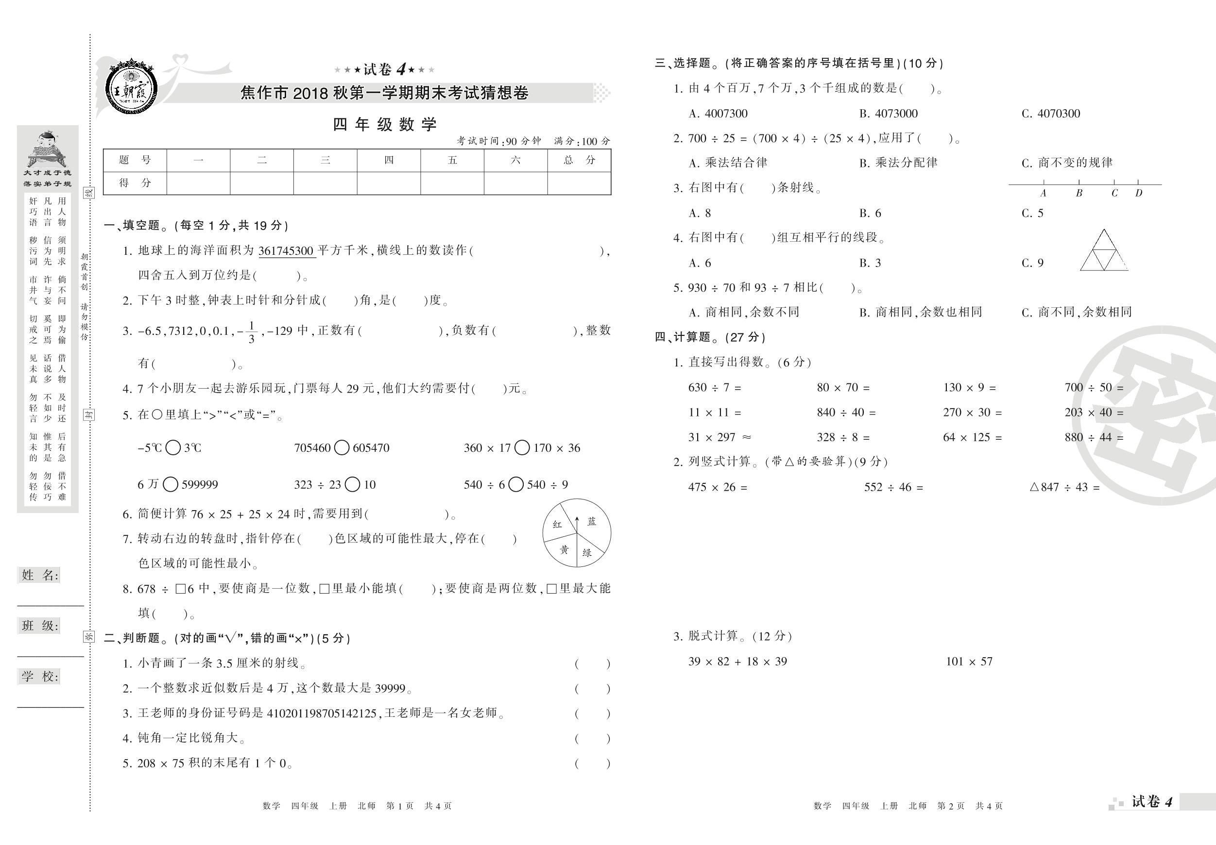 2017-2018学年第一学期焦作市猜想卷四年级数学试卷(北师版)【4】