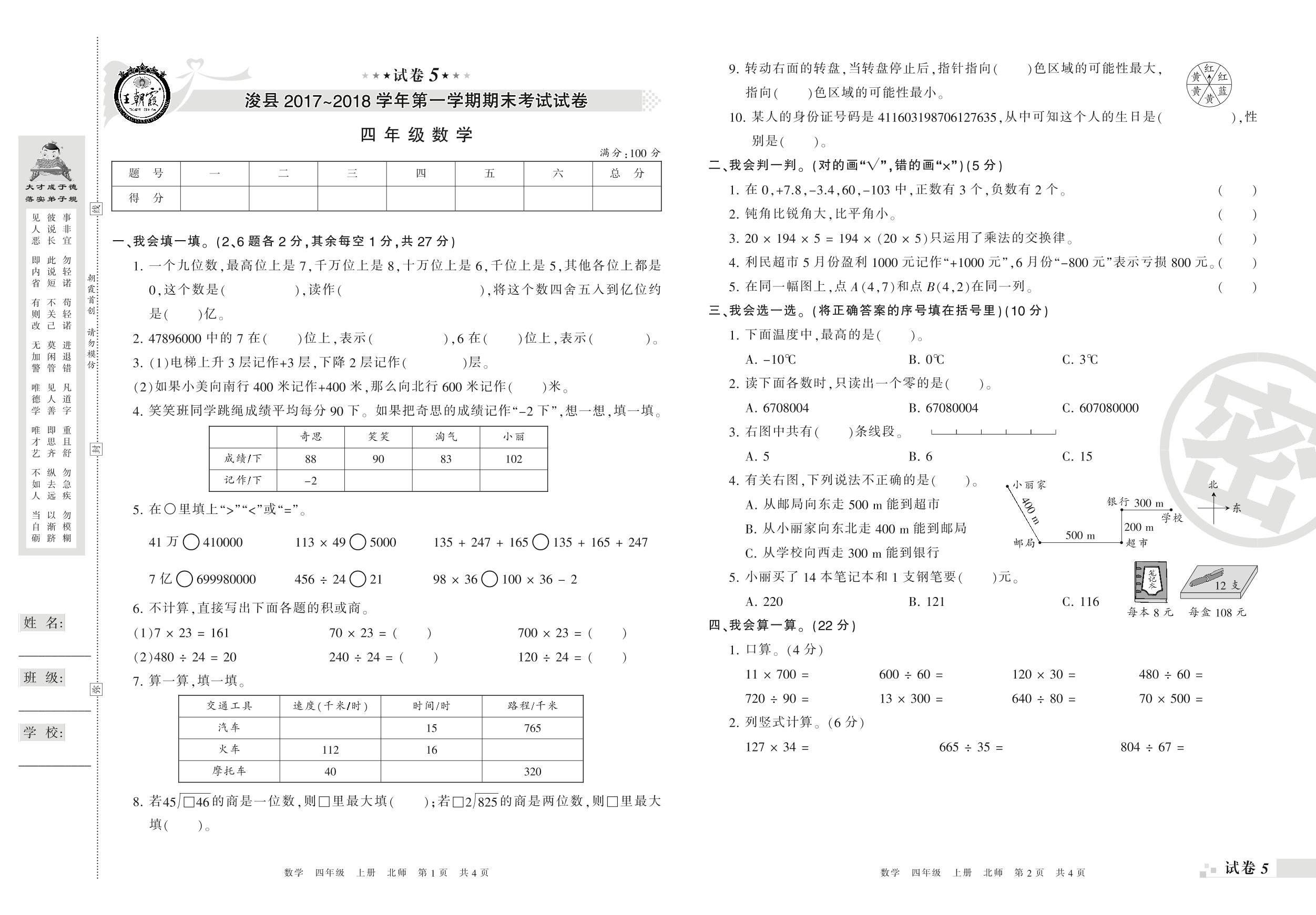 2017-2018学年第一学期鹤壁市浚县四年级数学试卷(北师版)【5】
