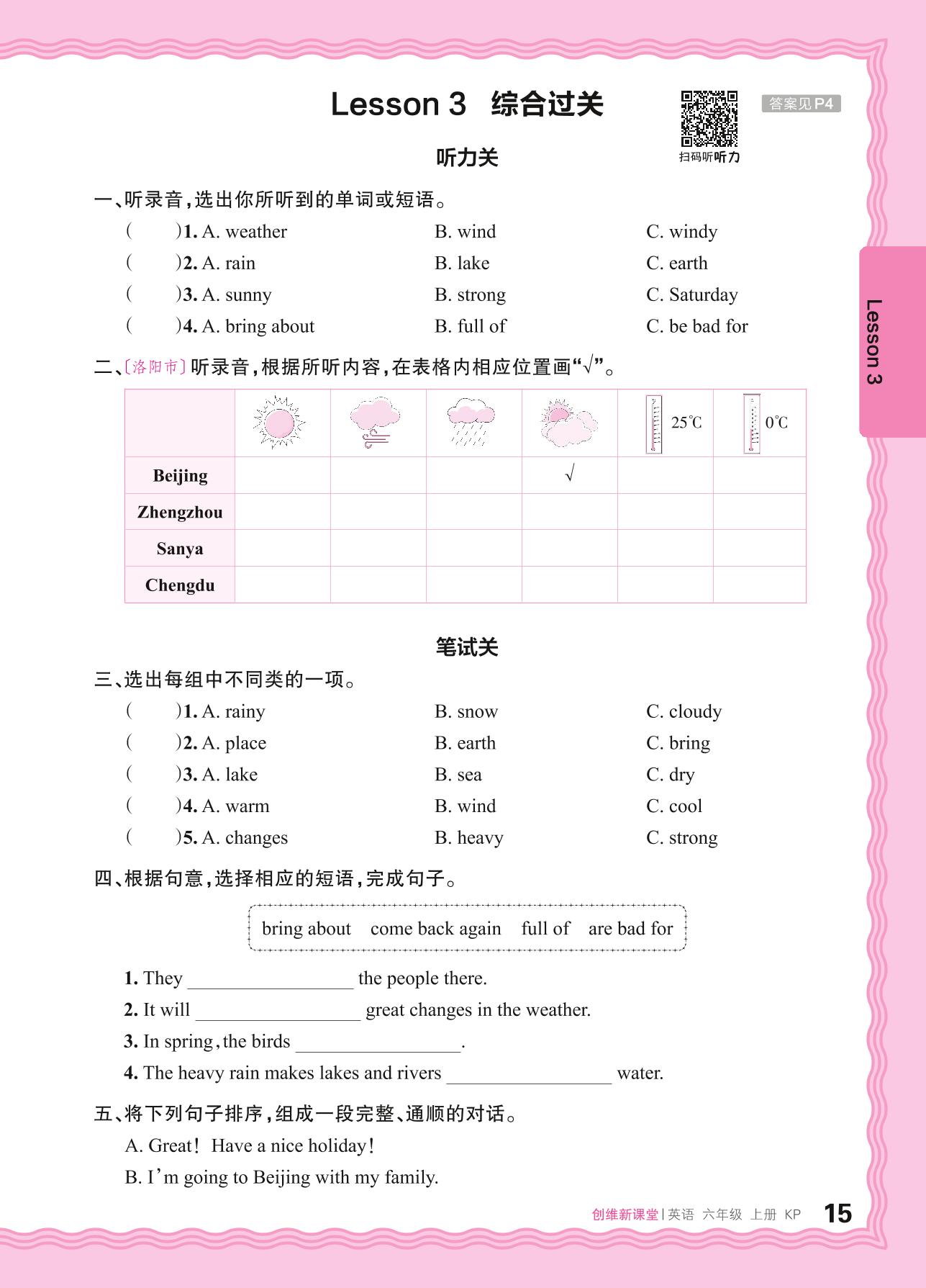 2024秋上册六年级英语科普版 Lesson 3 It will be sunny this Sunday.综合过关