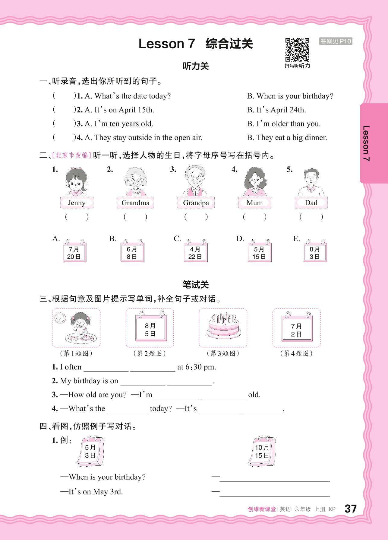 2024秋上册六年级英语科普版 Lesson 7 What's the date today?综合过关