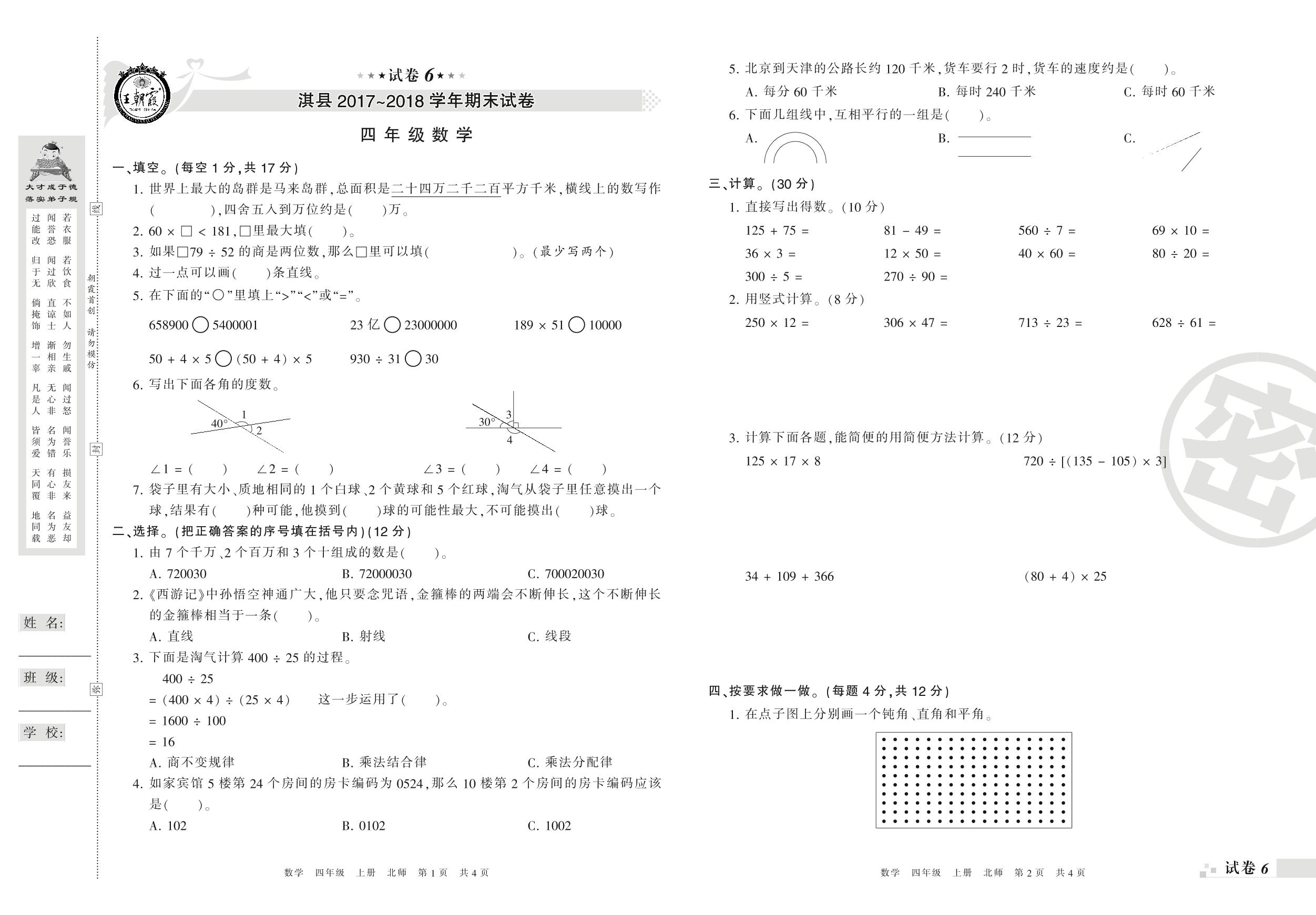 2017-2018学年第一学期鹤壁市淇县四年级数学试卷(北师版)【6】