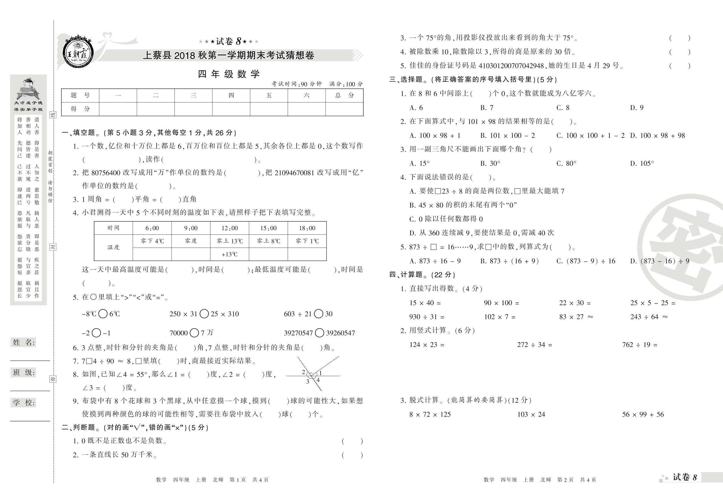 2017-2018学年第一学期驻马店市上蔡县四年级数学试卷(北师版)【8】