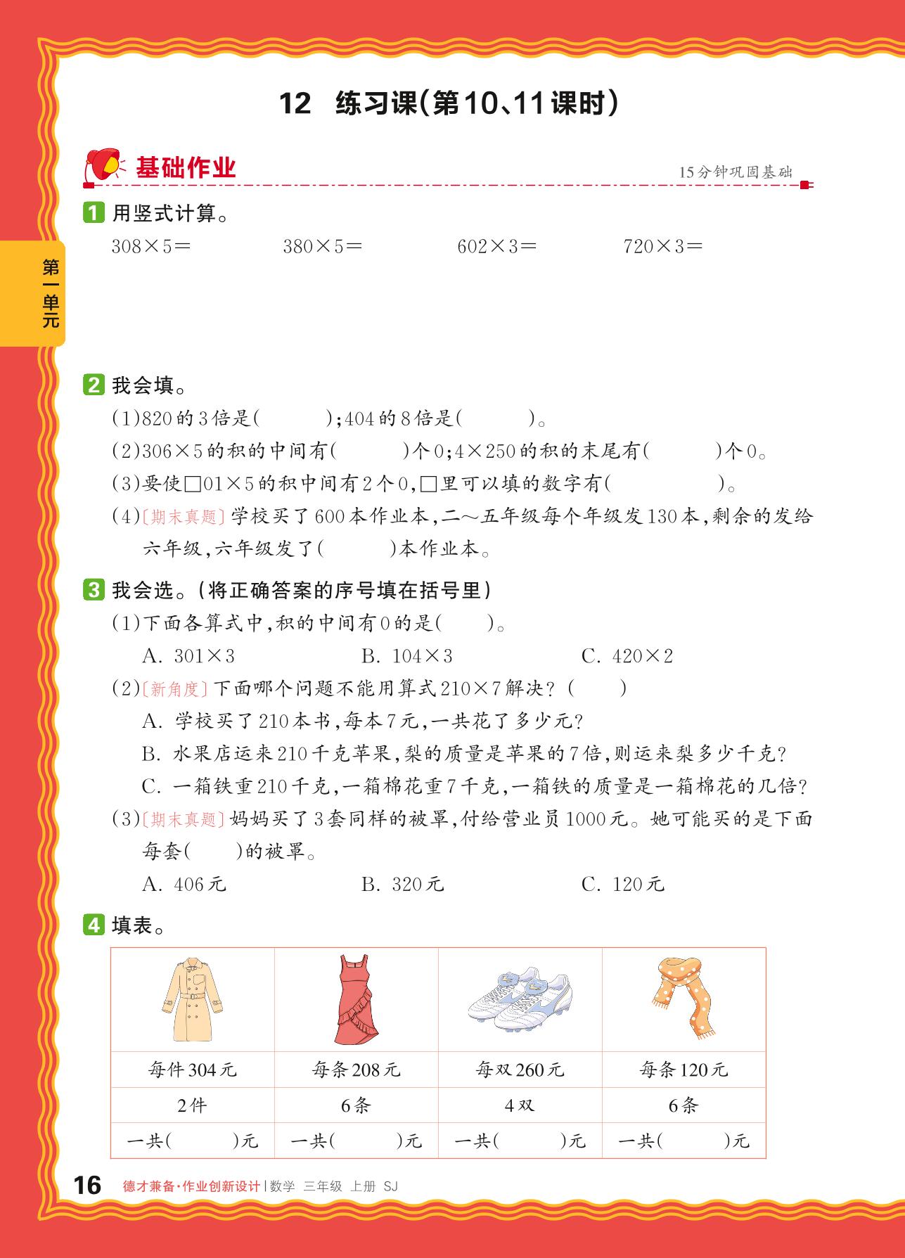 2024秋上册三年级数学苏教版 第一单元 两、三位数乘一位数——12. 乘数中间、末尾有0的乘法练习课