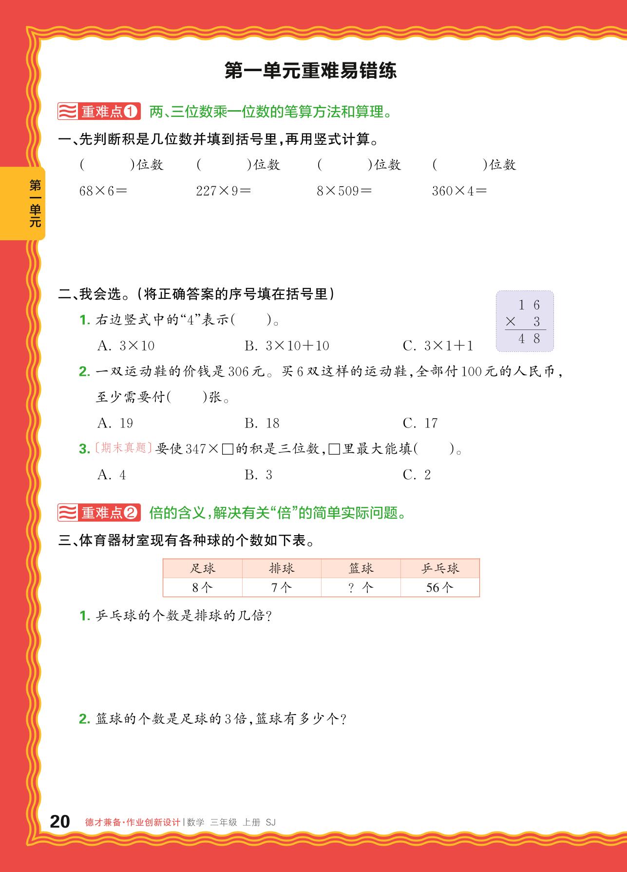 2024秋上册三年级数学苏教版 第一单元重难易错练