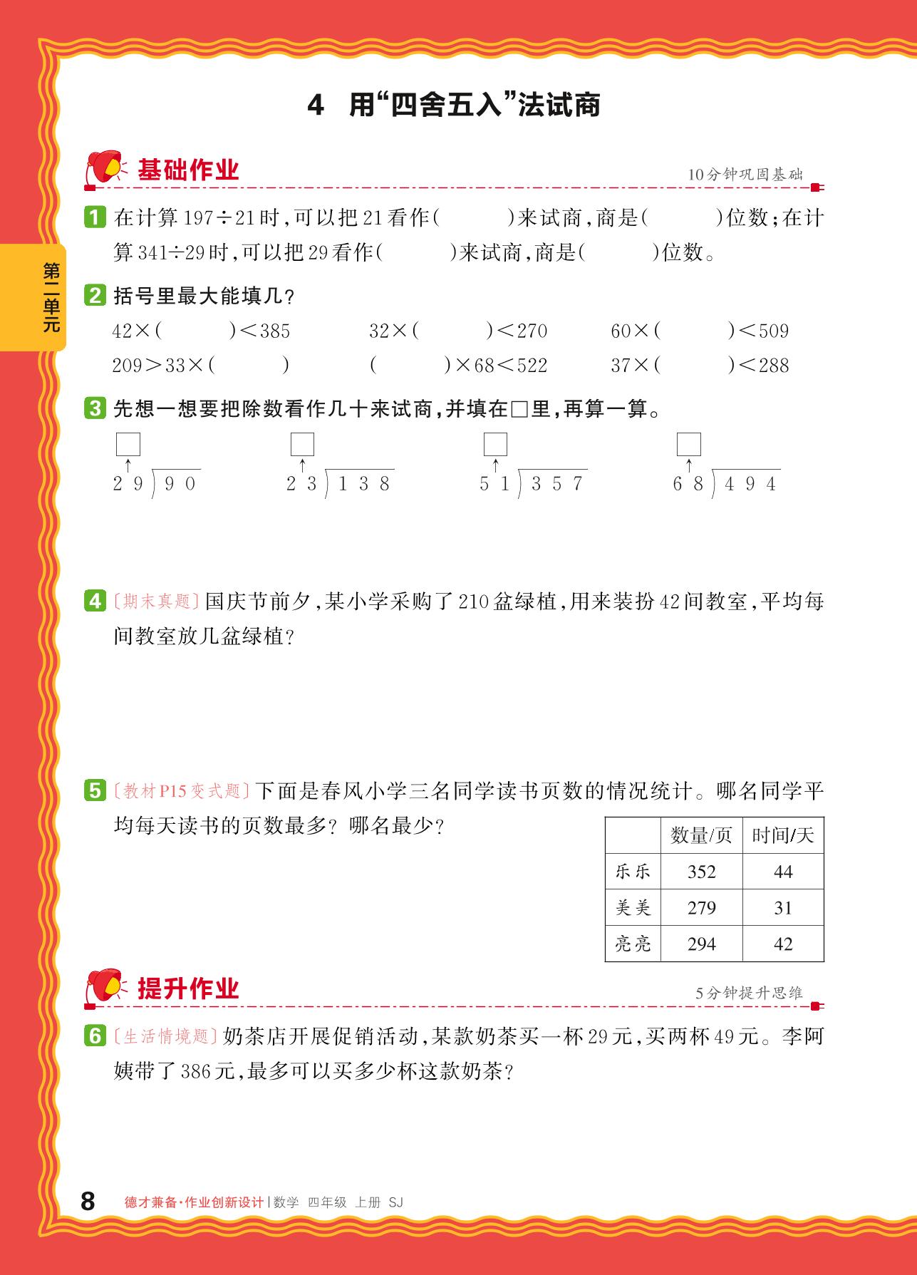 2024秋上册四年级数学苏教版 第二单元 两、三位数除以两位数——4. 用“四舍五入”法试商