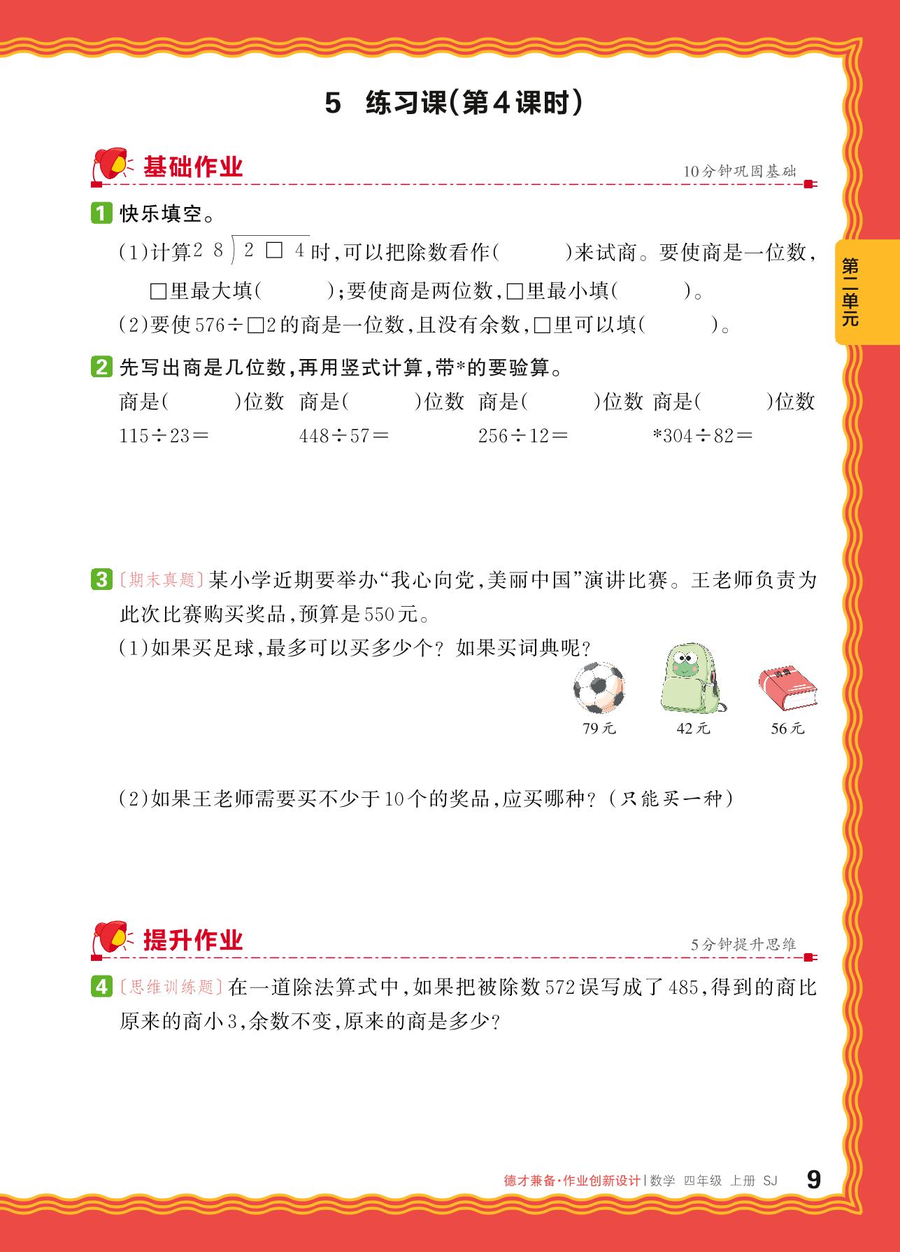 2024秋上册四年级数学苏教版 第二单元 两、三位数除以两位数——5. 用“四舍五入”法试商练习课