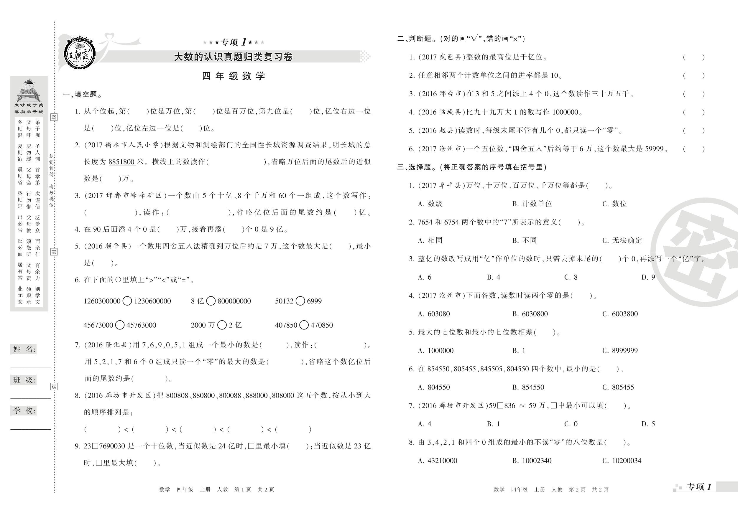 王朝霞期末专项卷——大数的认识、三位数乘两位数(一)真题归类复习卷四年级上册数学(人教版)_R210804155252【0】