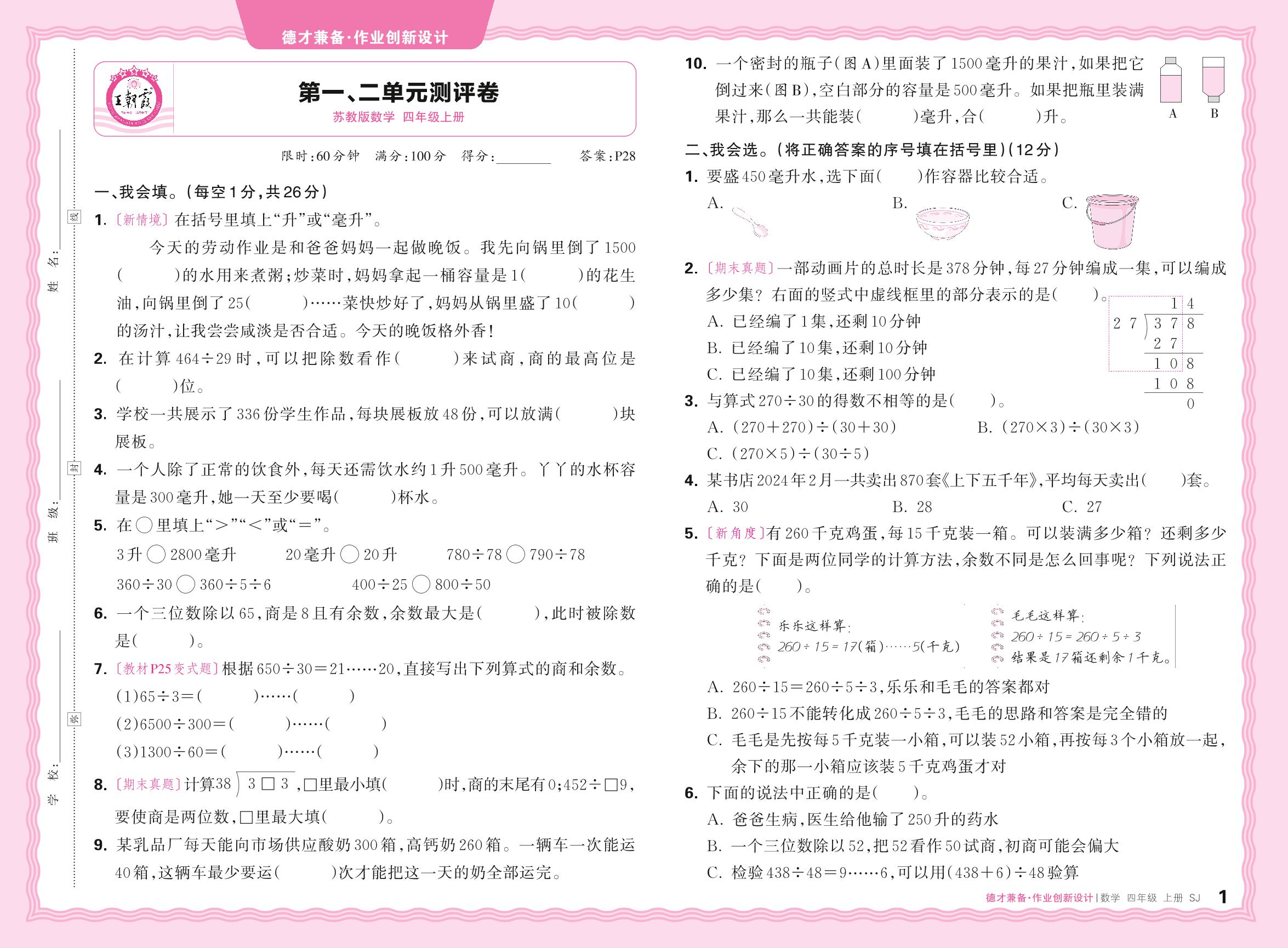 2024秋上册四年级数学苏教版 第一、二单元测评卷