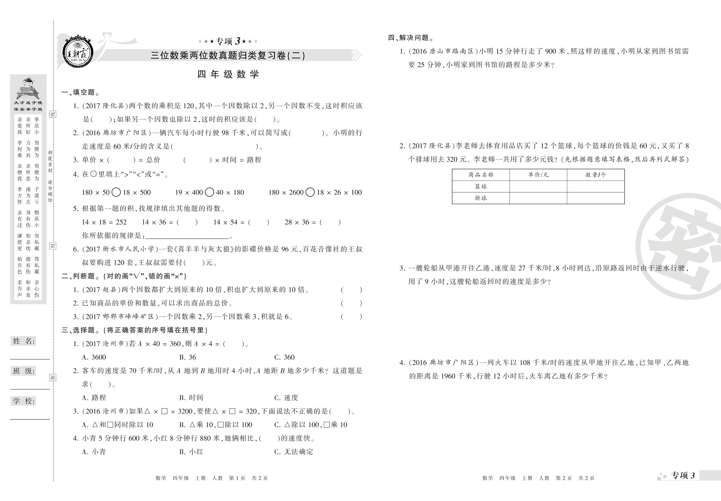 王朝霞期末专项卷——三位数乘两位数(二)、除数是两位数的除法(一)真题归类复习卷四年级上册数学(人教版)_R210804155257【0】