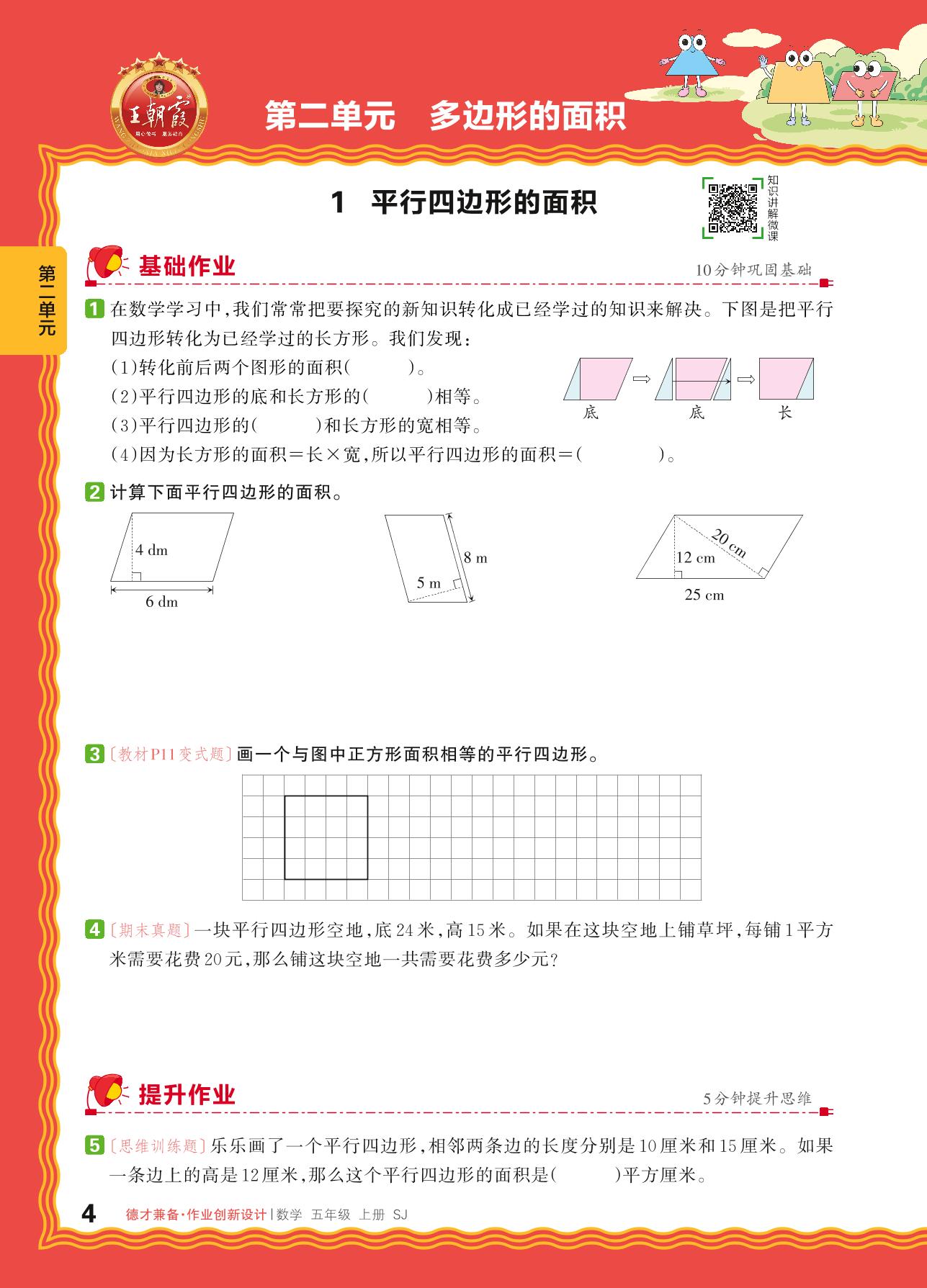 2024秋上册五年级数学苏教版 第二单元 多边形的面积——1. 平行四边形的面积