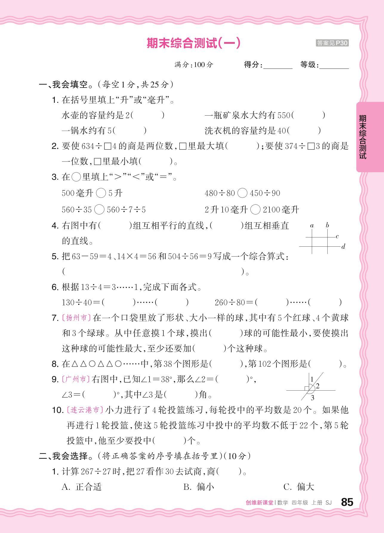 2024秋上册四年级数学苏教版 期末综合测试(一)