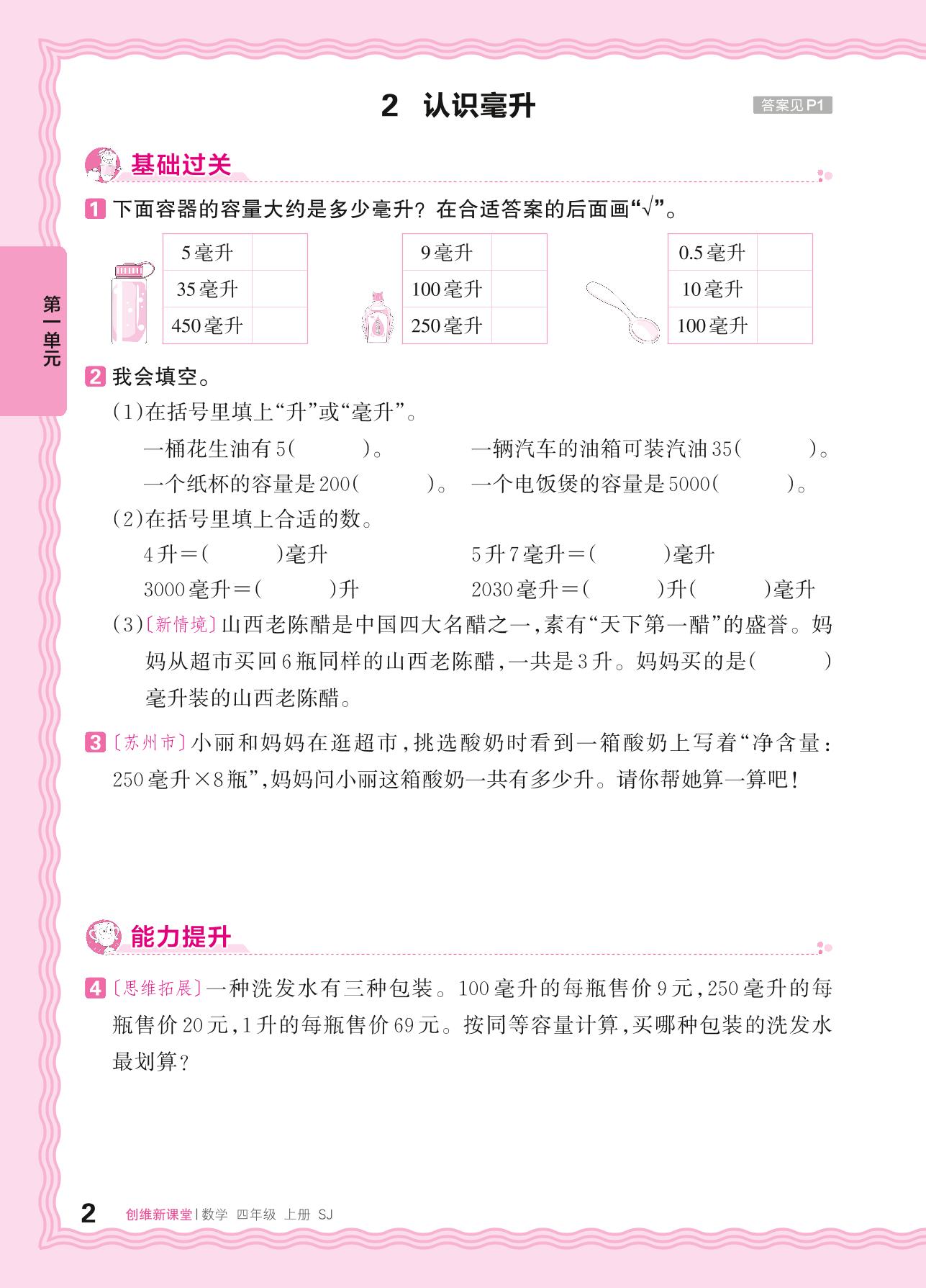 2024秋上册四年级数学苏教版 第一单元 升和毫升——2. 认识毫升