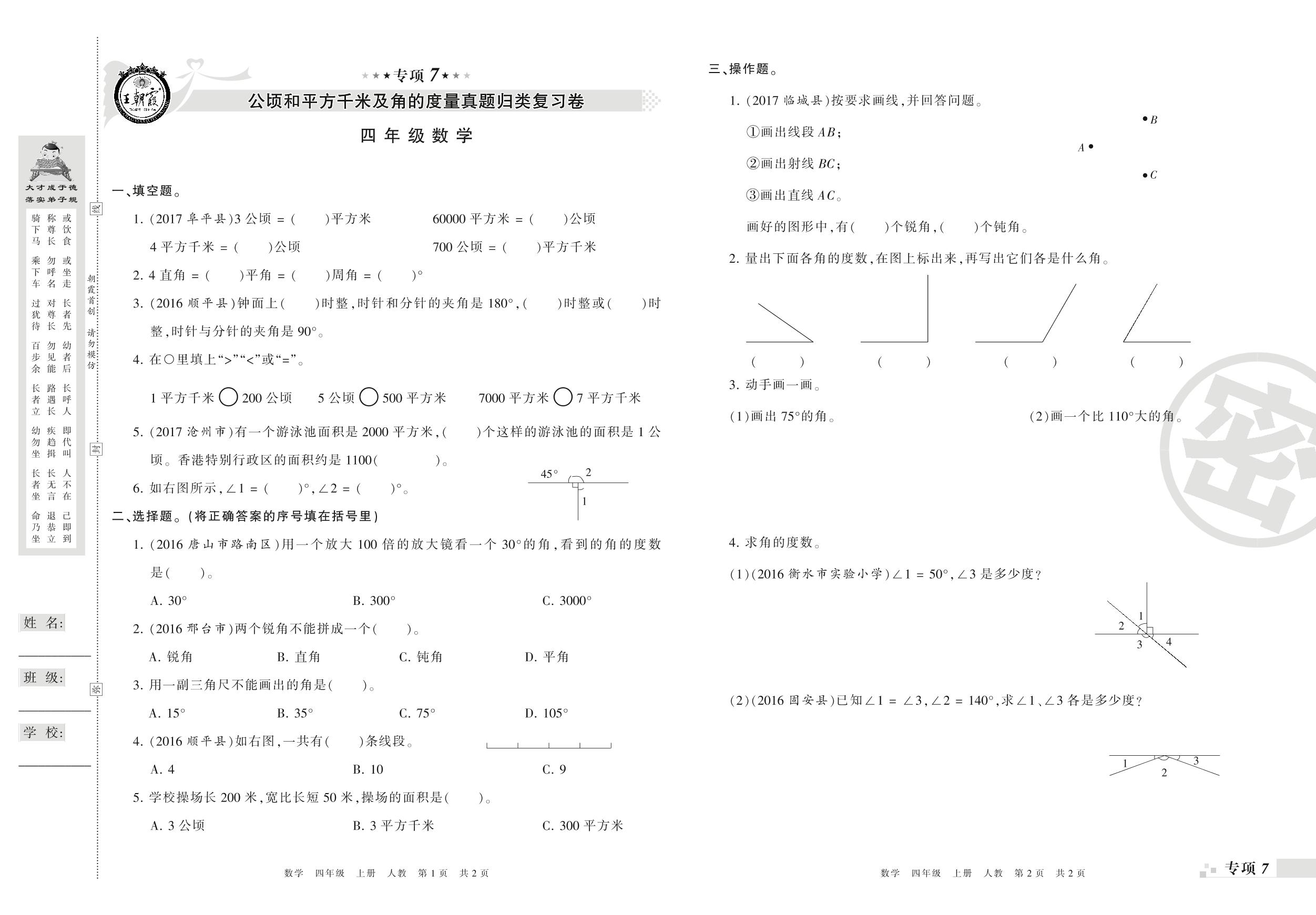 王朝霞期末专项卷——公顷和平方千米及角的度量、条形统计图及数学广角真题归类复习卷四年级上册数学(人教版)_R210804155308【0】