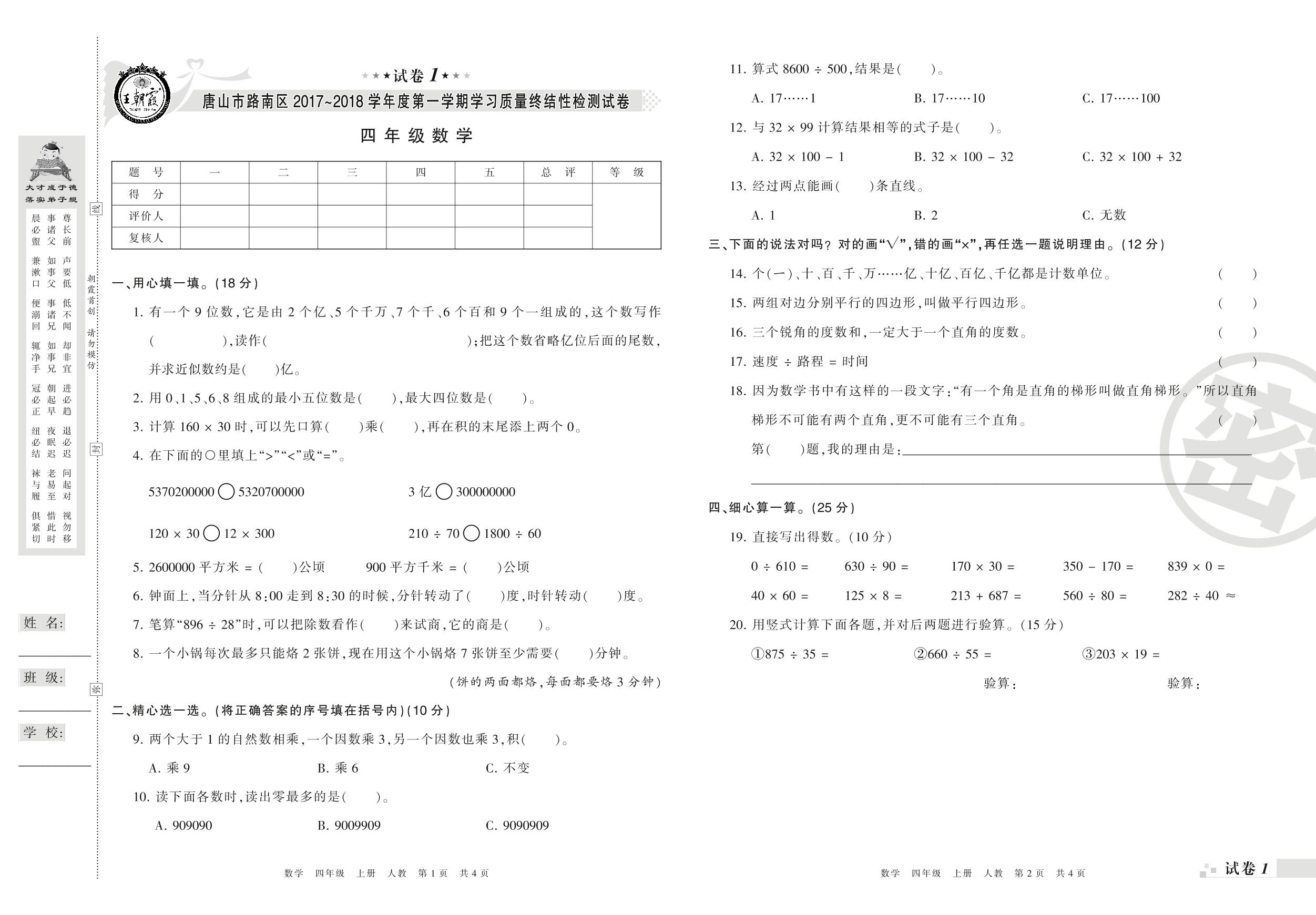 2017-2018学年第一学期唐山市路南区四年级数学试卷(人教版)【1】