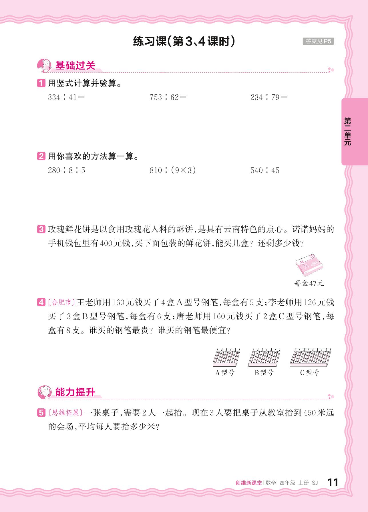 2024秋上册四年级数学苏教版 第二单元 两、三位数除以两位数——用“四舍五入”法试商、用连除解决实际问题练习课