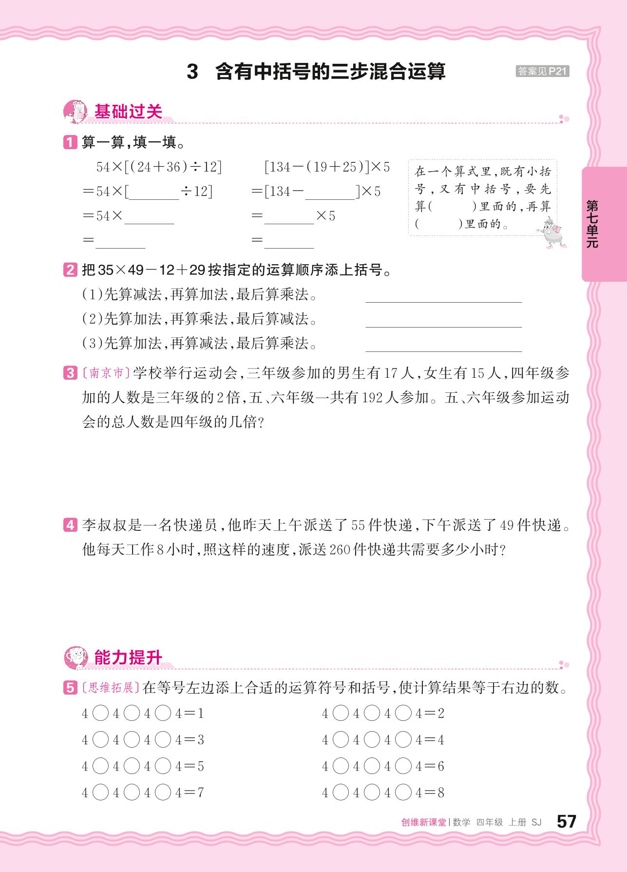 2024秋上册四年级数学苏教版 第七单元 整数四则混合运算——3. 含有中括号的三步混合运算