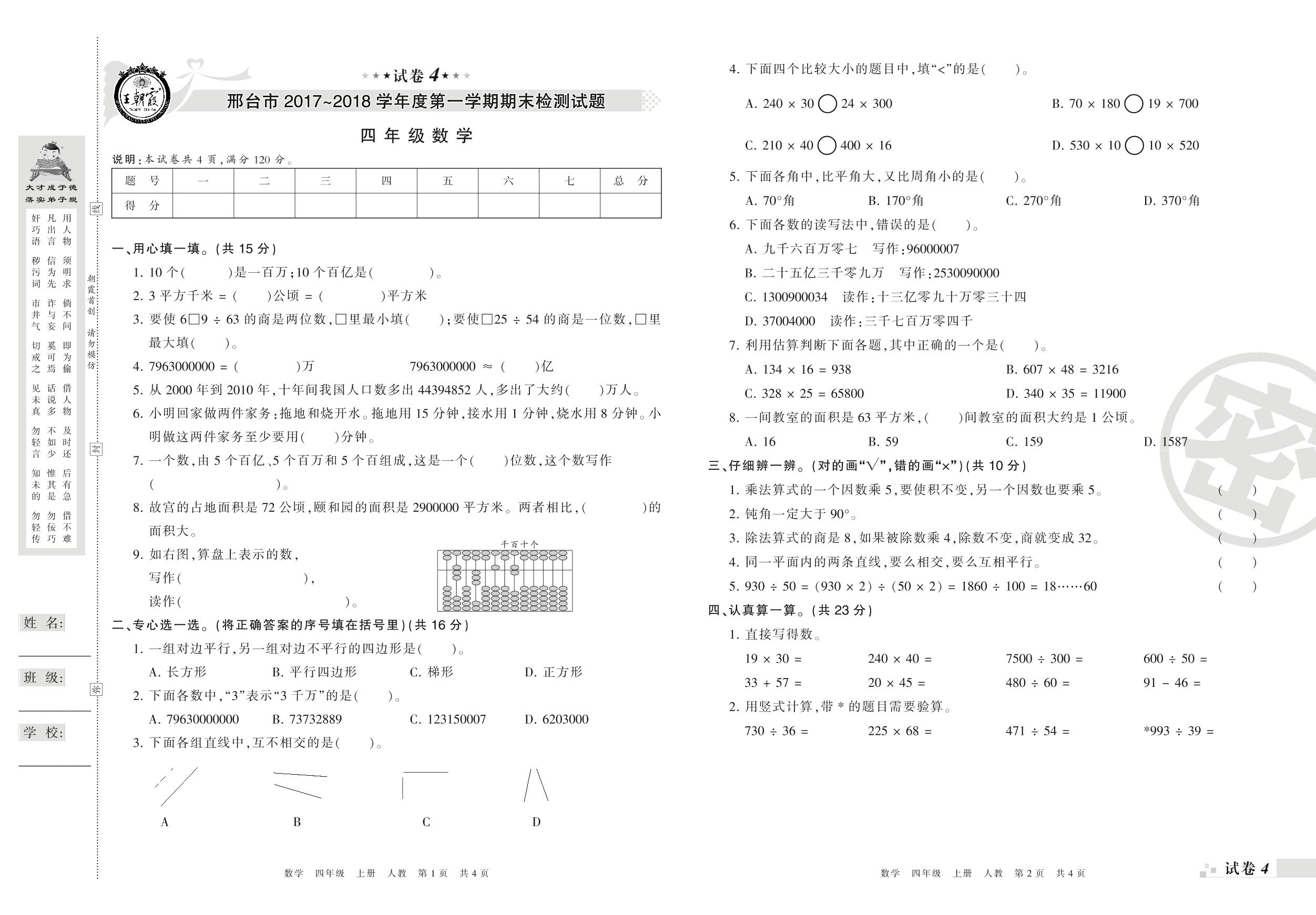 2017-2018学年第一学期邢台市四年级数学试卷(人教版)【4】