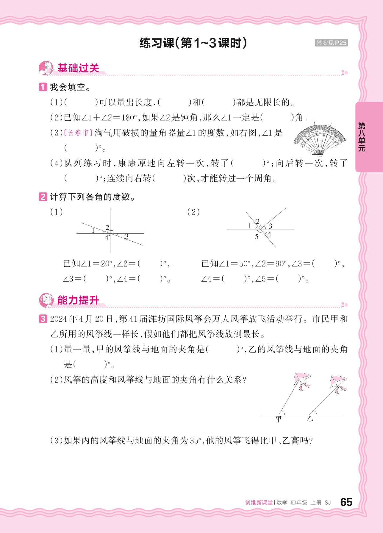2024秋上册四年级数学苏教版 第八单元 垂线与平行线——认识射线、直线和角及角的度量、分类和画法练习课