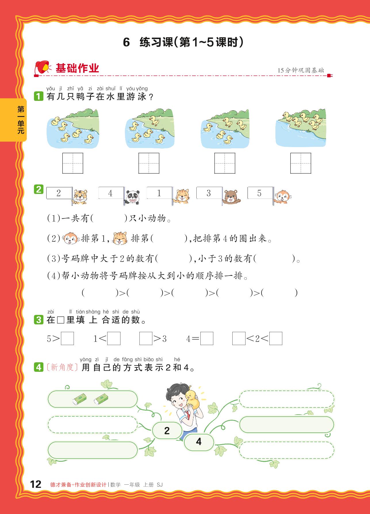 2024秋上册一年级数学苏教版 第一单元 0~5的认识和加减法——6. 认识1~5 几和第几 认识0 =和>、<练习课