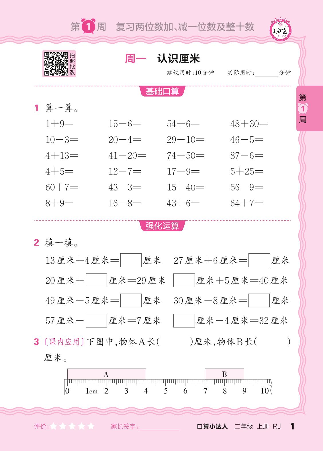 2024秋上册二年级数学人教版 口算计算专练 第1周