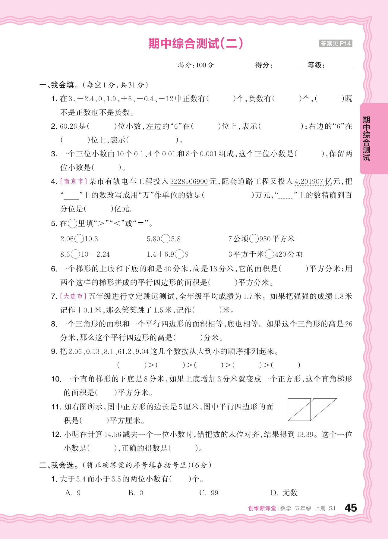 2024秋上册五年级数学苏教版 期中综合测试(二)
