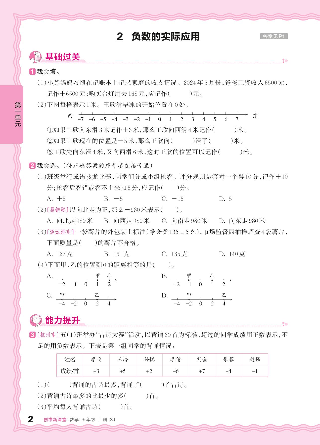 2024秋上册五年级数学苏教版 第一单元 负数的初步认识——2. 负数的实际应用_R240819114837530