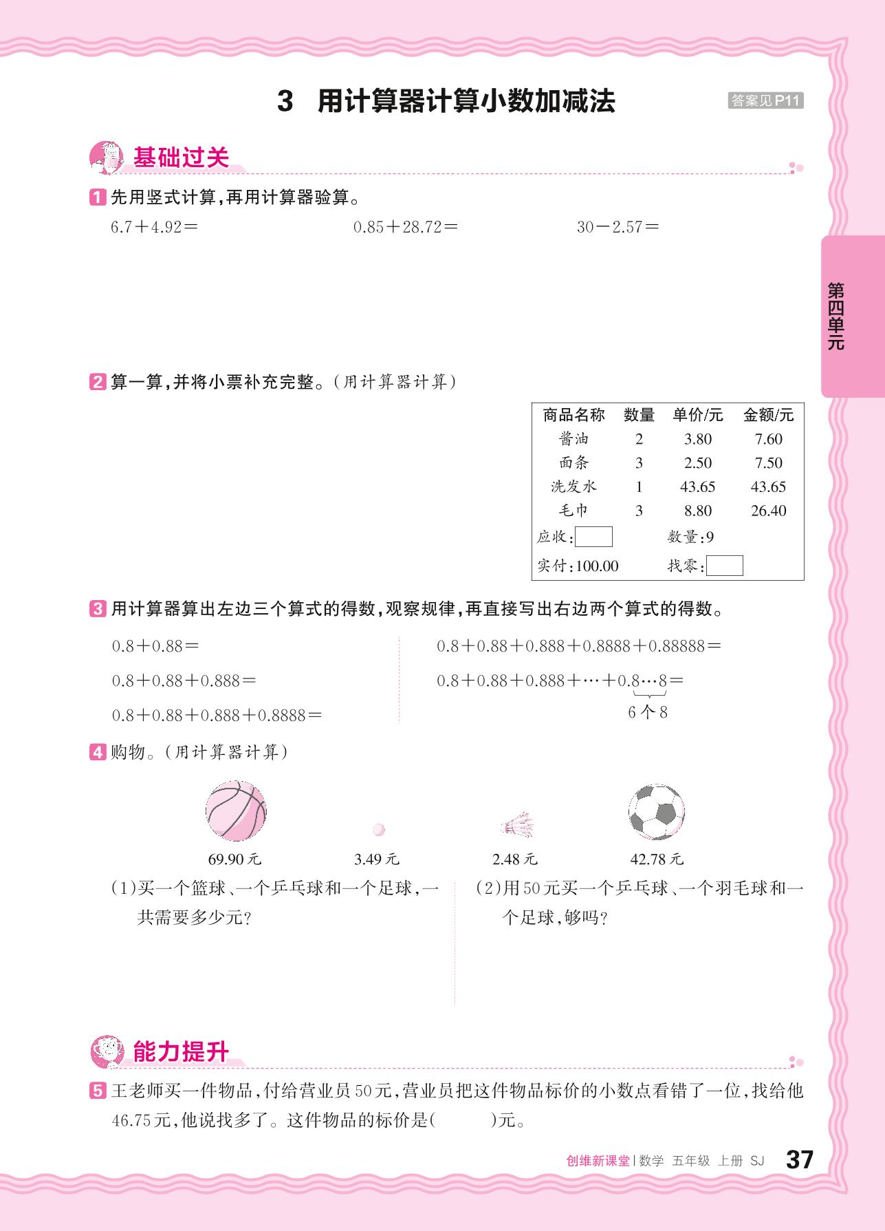 2024秋上册五年级数学苏教版 第四单元 小数加法和减法——3. 用计算器计算小数加减法