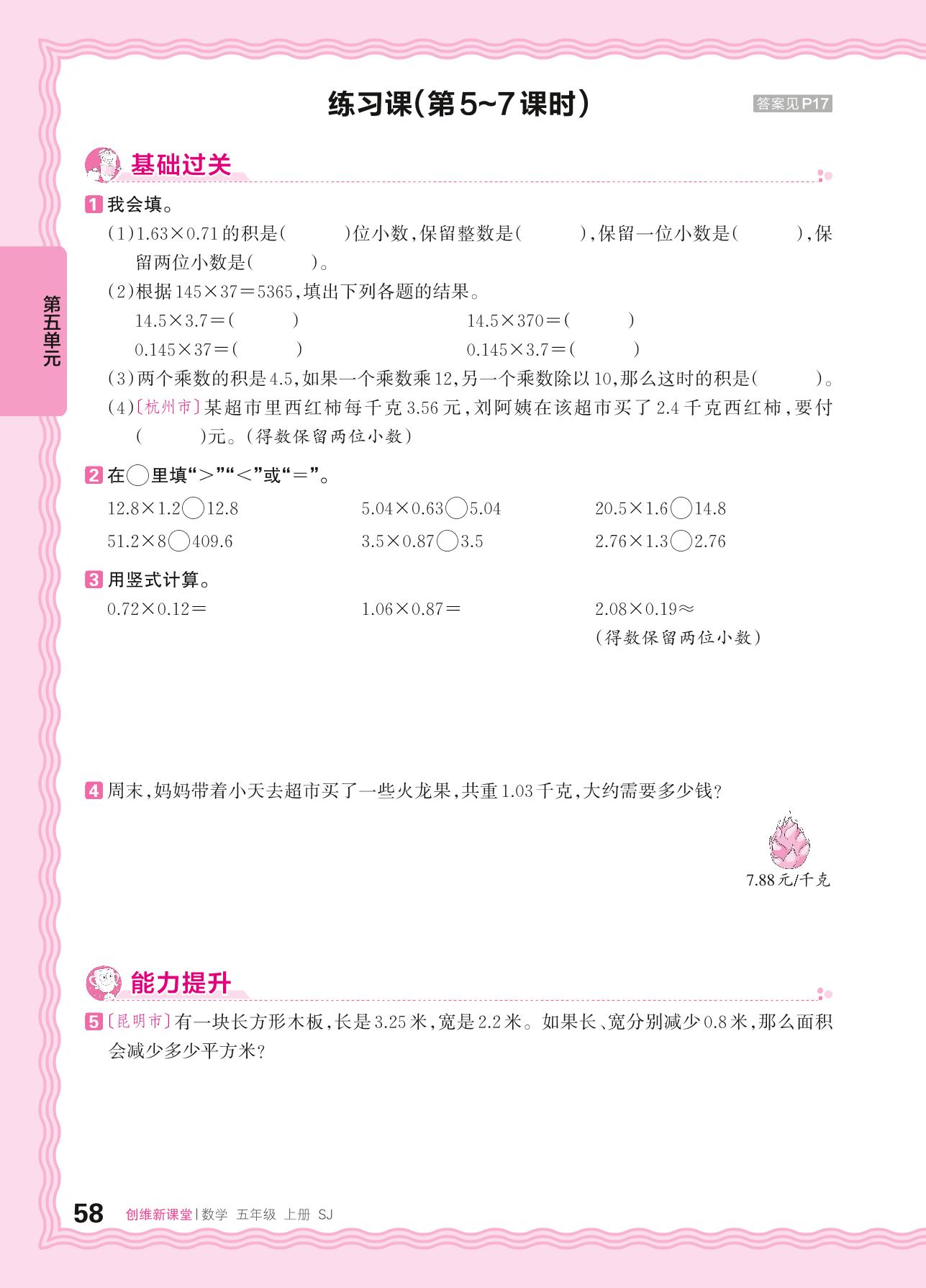 2024秋上册五年级数学苏教版 第五单元 小数乘法和除法——小数乘小数、积的近似值练习课