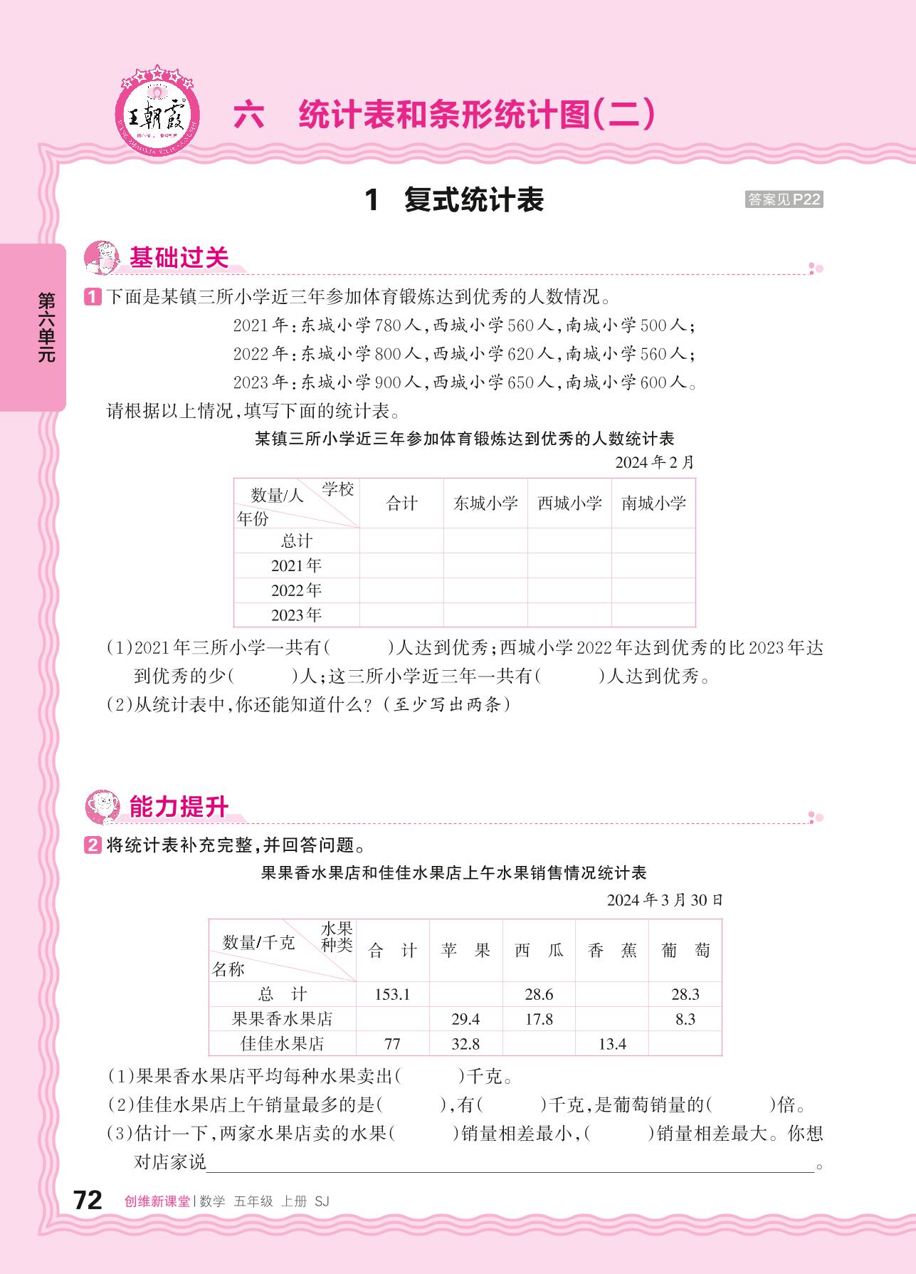 2024秋上册五年级数学苏教版 第六单元 统计表和条形统计图(二)——1. 复式统计表