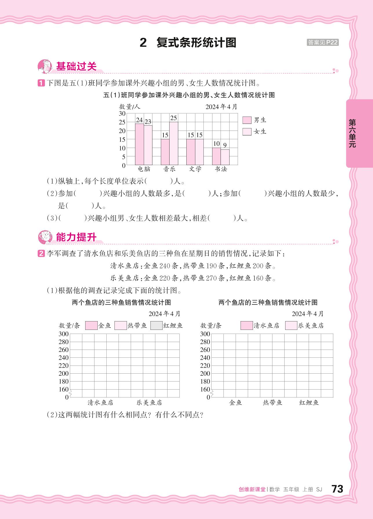2024秋上册五年级数学苏教版 第六单元 统计表和条形统计图(二)——2. 复式条形统计图