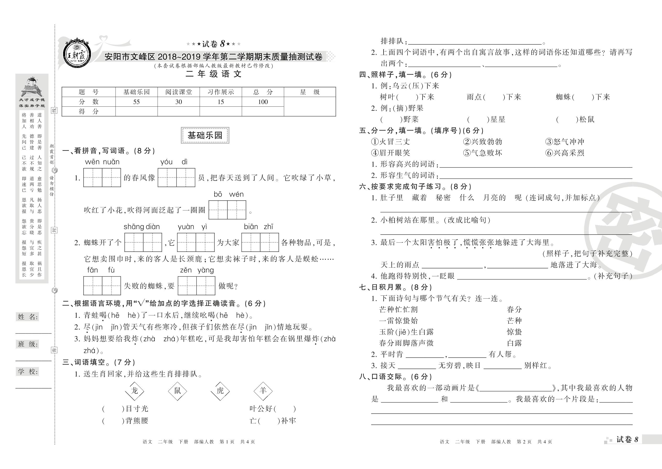2018-2019学年第二学期安阳市文峰区二年级语文试卷(人教版)【8】